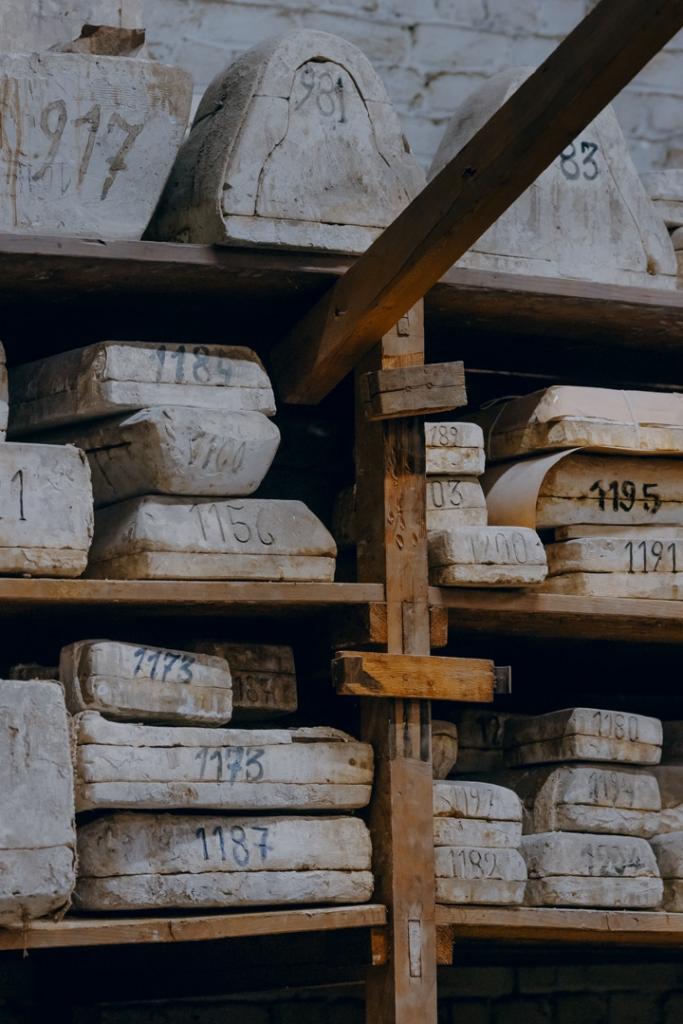 We volgen de meestergieter naar het magazijn, waar de mallen netjes genummerd op planken staan. De inventaris vermeldt er vijfduizend, maar ze bestaan vaak uit verschillende delen, zoals een 3D-puzzel. In werkelijkheid zijn het waarschijnlijk meer dan 15.000 stukjes. ‘We hebben nog niet de tijd gehad om ze te tellen’, zegt Demulder.