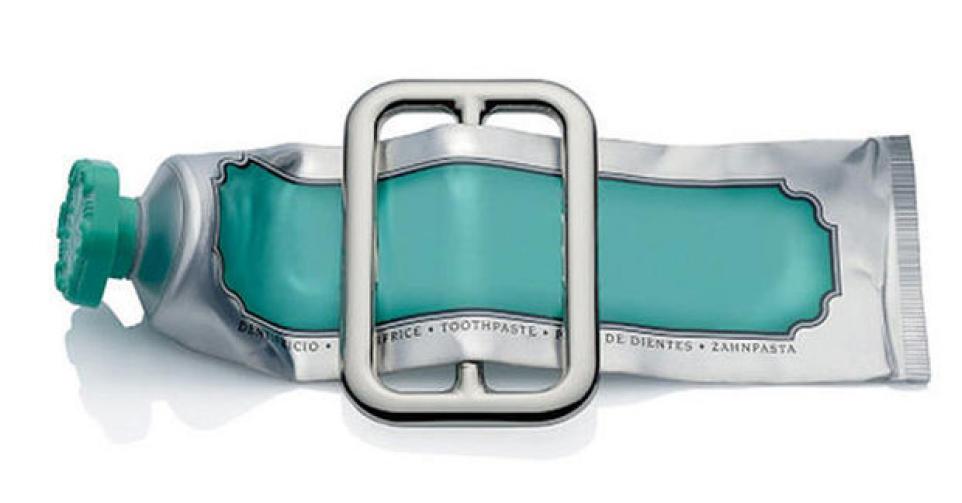 Zoals een gesp helpt om een broeksriem aan te spannen, haalt het kleinood de laatste druppel uit eender welke tube, of die nu tandpasta, mayonaise of een gezichtscrème bevat. Een leuke aanwinst in de strijd tegen verspilling. (LR)