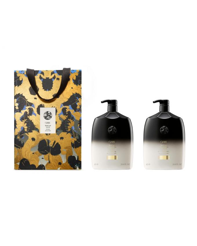 De producten uit het Gold Lust-gamma van Oribe bevatten – zoals de naam al doet vermoeden – fijne goudkleurige pigmenten die het haar meteen extra glans geven. In deze geschenkdoos zitten twee literflessen van de iconische shampoo en conditioner. Ben je meteen weer een hele tijd zoet mee.
