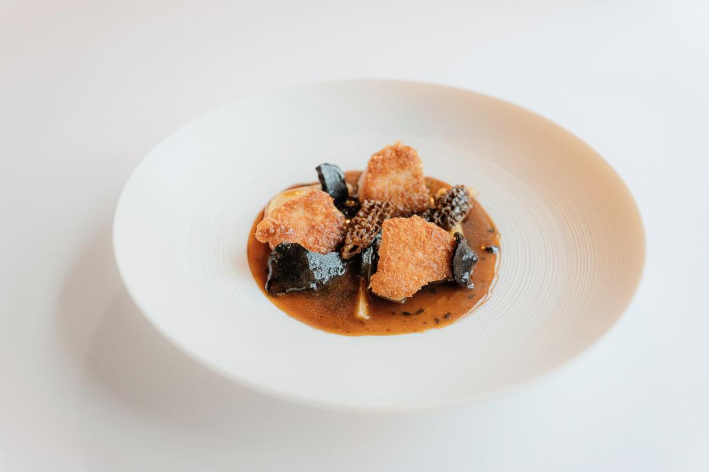 Die stijl houdt de chef aan bij de voorgerechten. De perfect krokant gebakken kalfszwezeriken met schorseneer en morieljes en truffeljus zijn hemels, maar mochten misschien iets soberder afgewerkt zijn. De sint-jakobsnoten met grondwitloof aan mijn kant zijn minstens even fantastisch en zeker ook meer dan voldoende afgekruid. De laatste slok champagne van het aperitief is de ideale aanvulling.