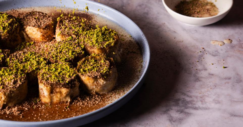 5. Leg de rolletjes met een tang in een serveerschaal. Schenk de afgekoelde siroop erover en laat ze op kamertemperatuur trekken voor je ze afdekt met folie en minstens 3 à 4 uur in de koelkast zet. Bestrooi voor het serveren met het cacaopoeder, de geraspte chocolade en gemalen pistachenoten.