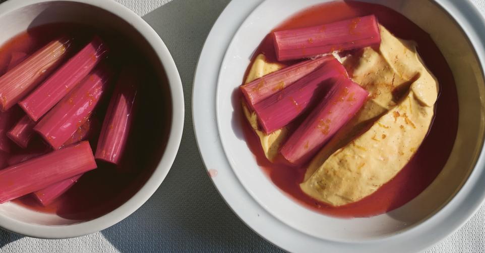 5. Zet de opgesteven custard met de rabarber op tafel en geef het kookvocht erbij. Bestrooi alles met een laatste restje sinaasappelrasp.