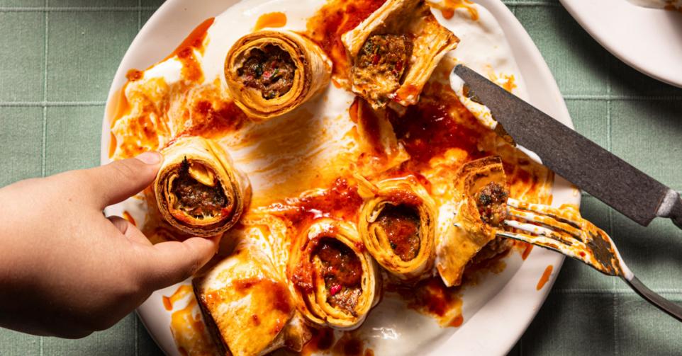 Hale Amus: ‘Deze snelle versie van beyti kebap komt van Özge Candanoglu – ingenieur, werkende moeder en gepassioneerd gastronoom. Nadat ze van Turkije naar Rotterdam verhuisde, bleef ze haar culinaire ontdekkingen verkennen en delen – van restaurantervaringen tot traditionele Turkse smaken – via haar Instagrampagina Damaktandimaga. Ze organiseert ook pop-up-mezze-evenementen, waarbij ze haar liefde voor lekker eten en Turkse gastvrijheid aan een breder publiek laat zien. Özges originele recept vroeg om yufkafilodeeg, maar de strijd om er te vinden dat niet als karton is, dwong me om het nog verder te vereenvoudigen, met haar goedkeuring, door in plaats daarvan tortilla’s te gebruiken. Het resultaat is een gerecht dat net zo smaakvol is, maar veel gemakkelijker te maken. Perfect voor drukke dagen, etentjes of wanneer je iets indrukwekkends wilt serveren zonder uren in de keuken te staan.’