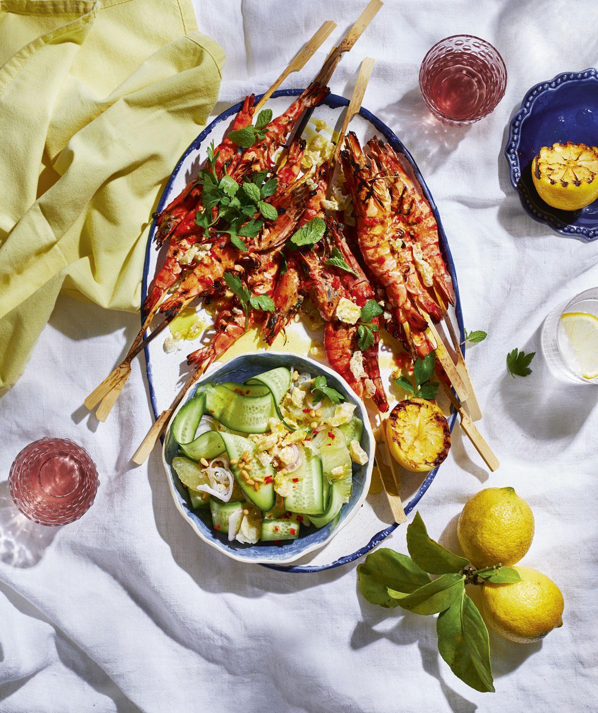 7. Gegrilde garnalen met krokante komkommer-pomelosalade