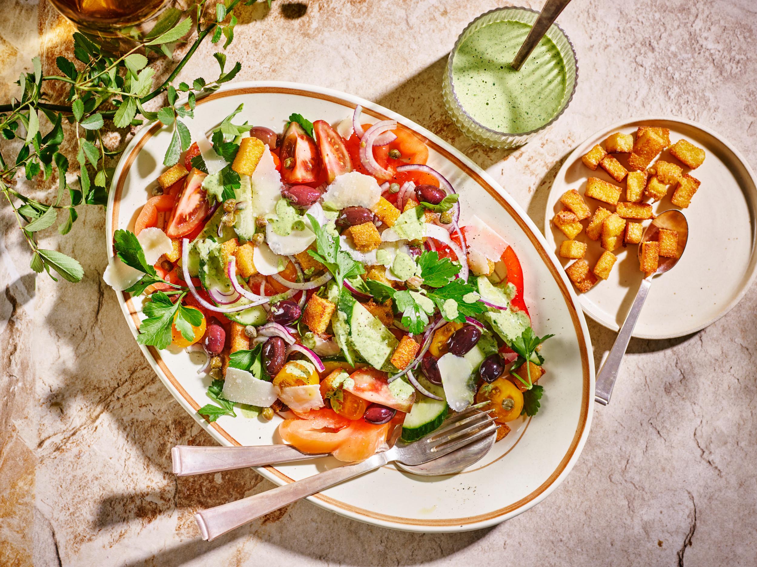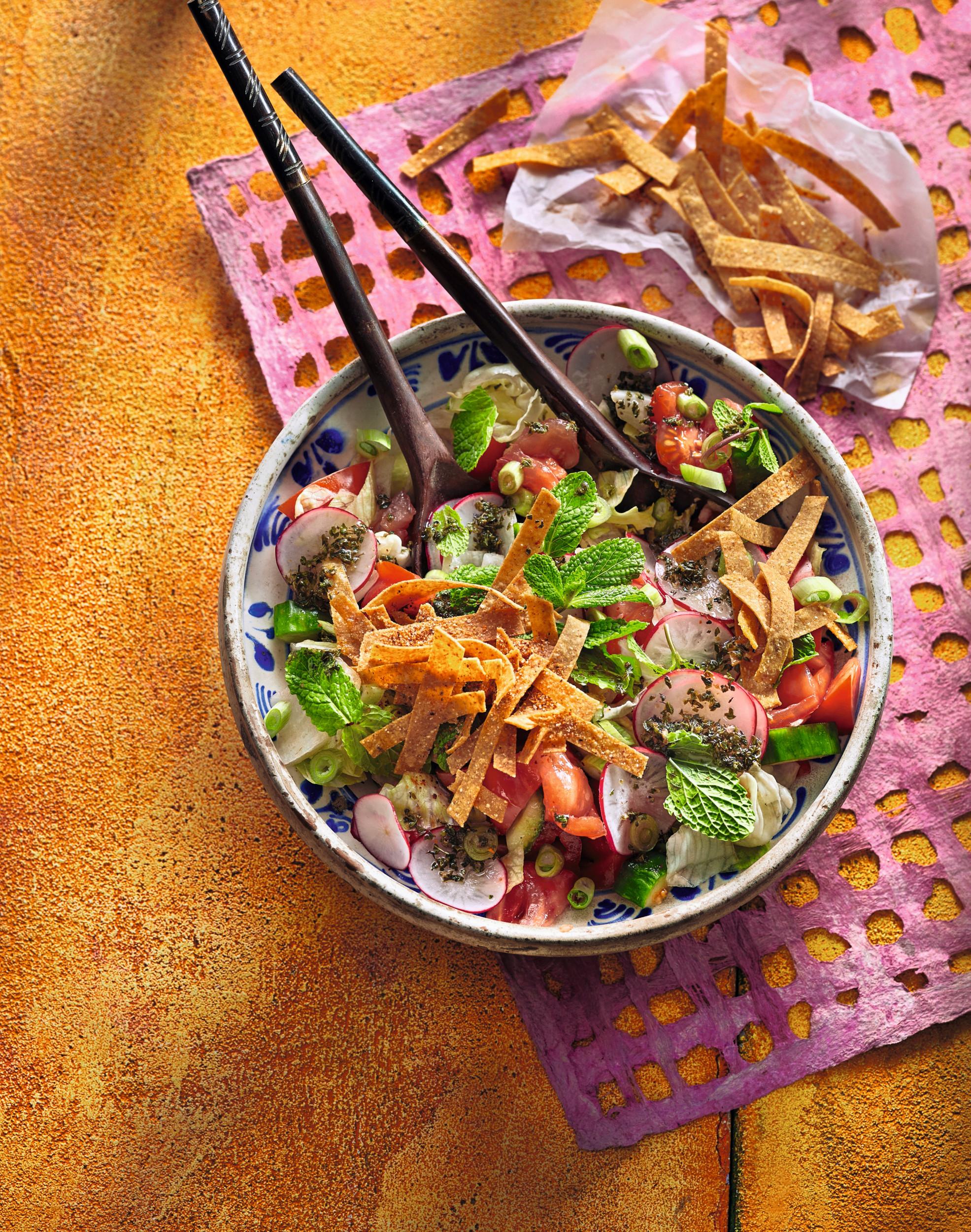 Dat de Palestijnse keuken barst van de smaak, bewijst chef en Ottolenghi-sidekick Sami Tamimi. Hij gaf een eigen draai aan de klassieke fattoush met verfrissende komkommer. Kleurrijk, crunchy en vol verse kruiden. Ook ideaal om koelkastresten op te werken.
