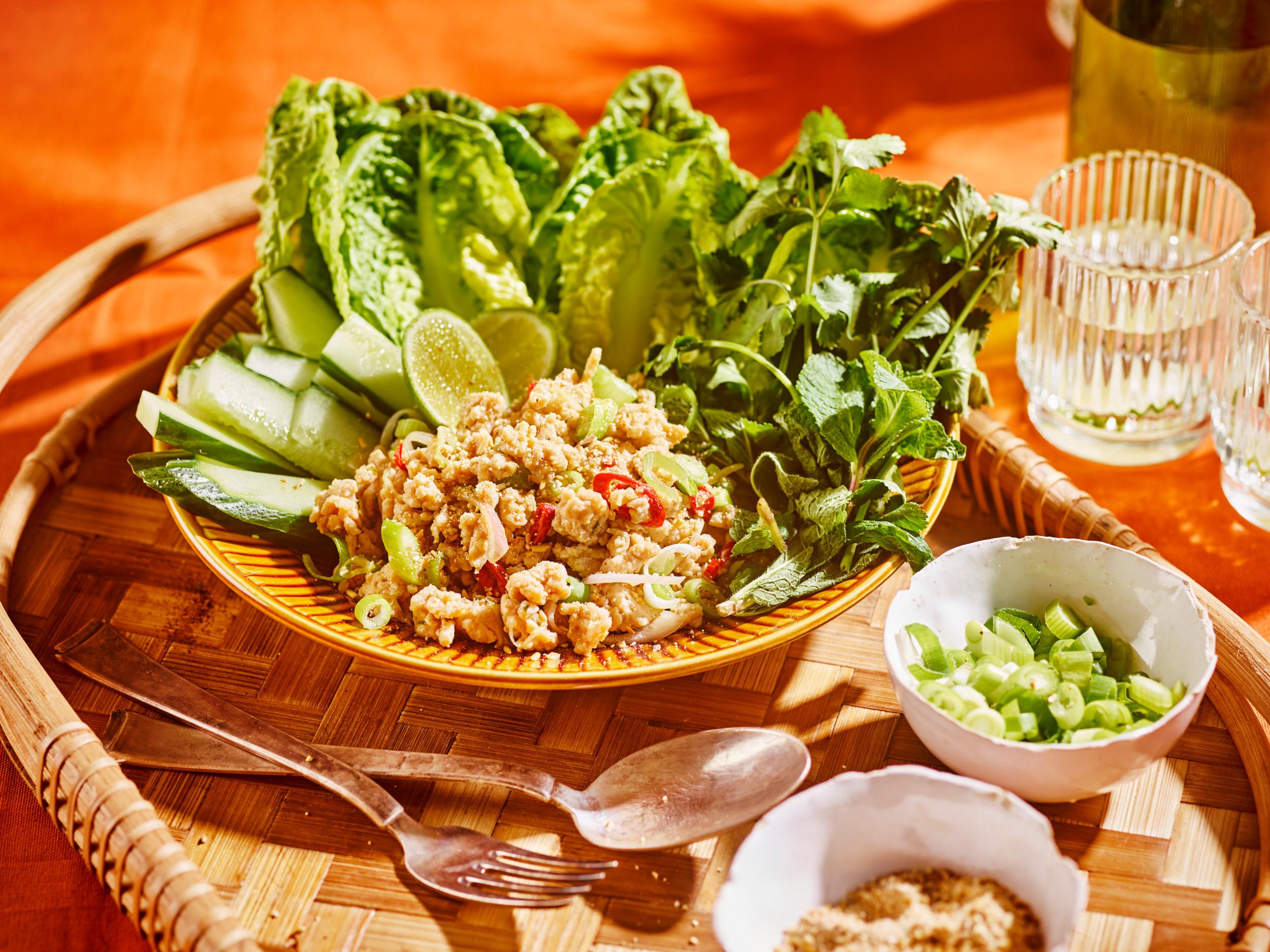 Deze pittige Thaise laab kai wordt opgefrist met komkommer, de gemalen geroosterde rijst geeft dan weer een diepe, rokerige smaak. Maak er meteen een grote hoeveelheid van, de rijst blijft fris bewaard tot twee weken goed.