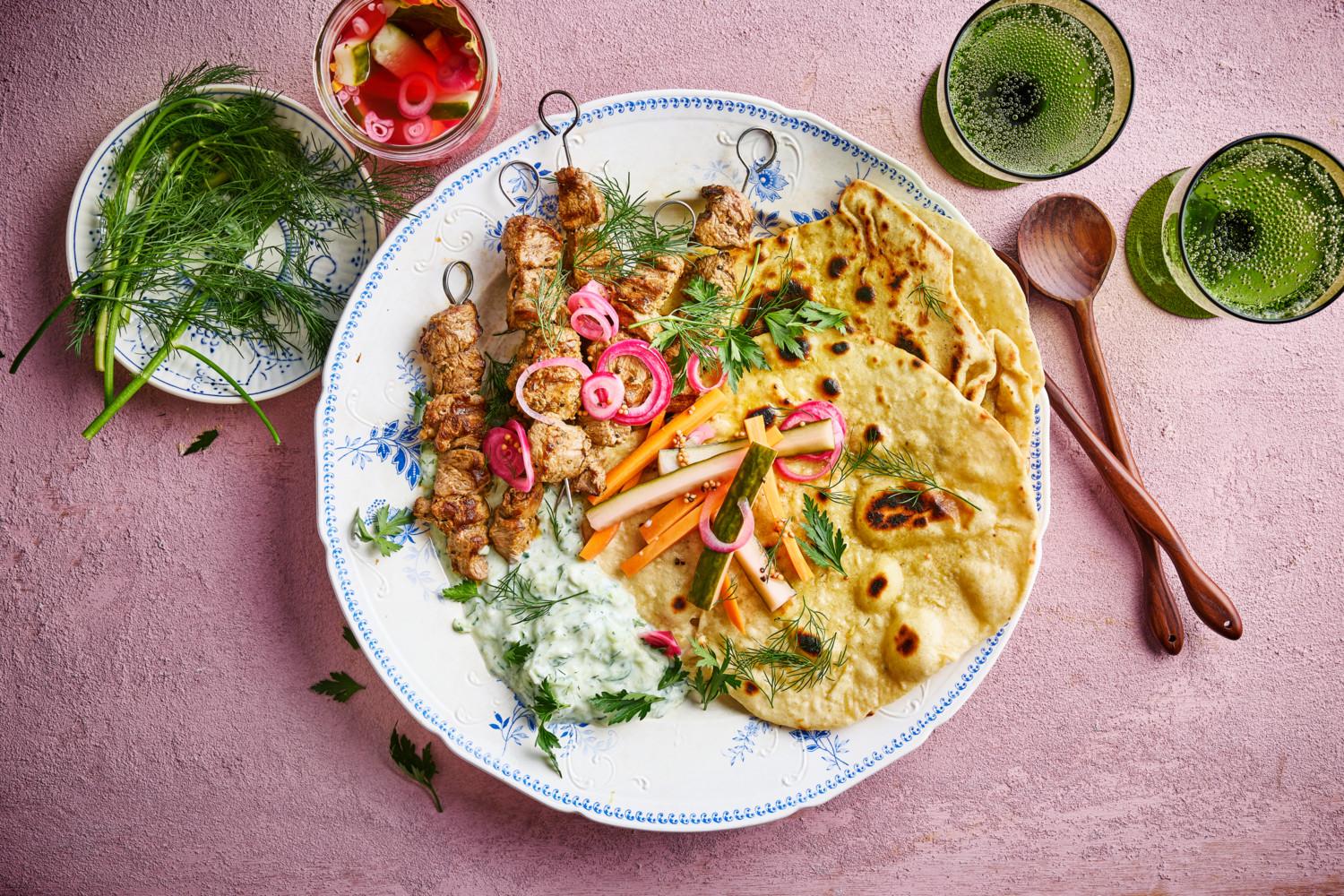 Liever niet richting laars, dan zijn deze Grieks geïnspireerde lamsspiesjes met tzatziki en gepekelde groenten een even zonnig alternatief. Marineer de spiesjes vooraf om ze lekker sappig te houden.