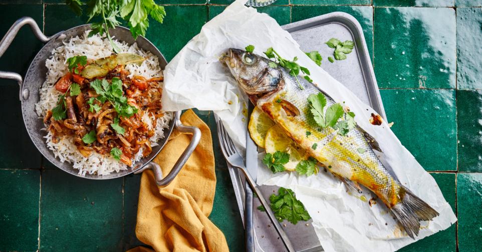 Haast en spoed zijn zelden goed. Gelukkig is er in het weekend extra veel tijd om nieuwe recepten uit te proberen. Deze week maken we een eigen variant op een Indische biryani, waarbij we een volledige zeebaars serveren.