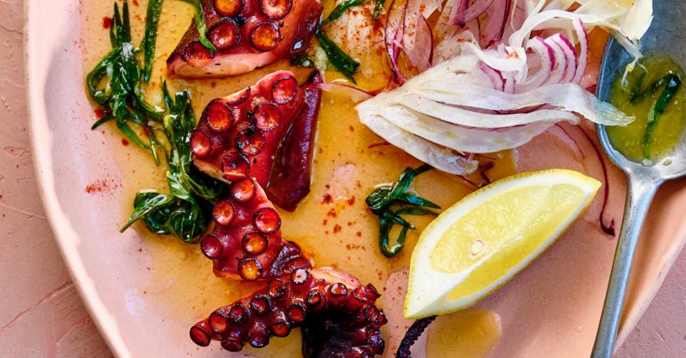 6. Giet de venkel en rode ui af. Verdeel de octopustentakels over 4 borden en leg er wat venkel en rode ui naast. Lepel de warme citroen-dragonboter erover en leg er een partje citroen bij.