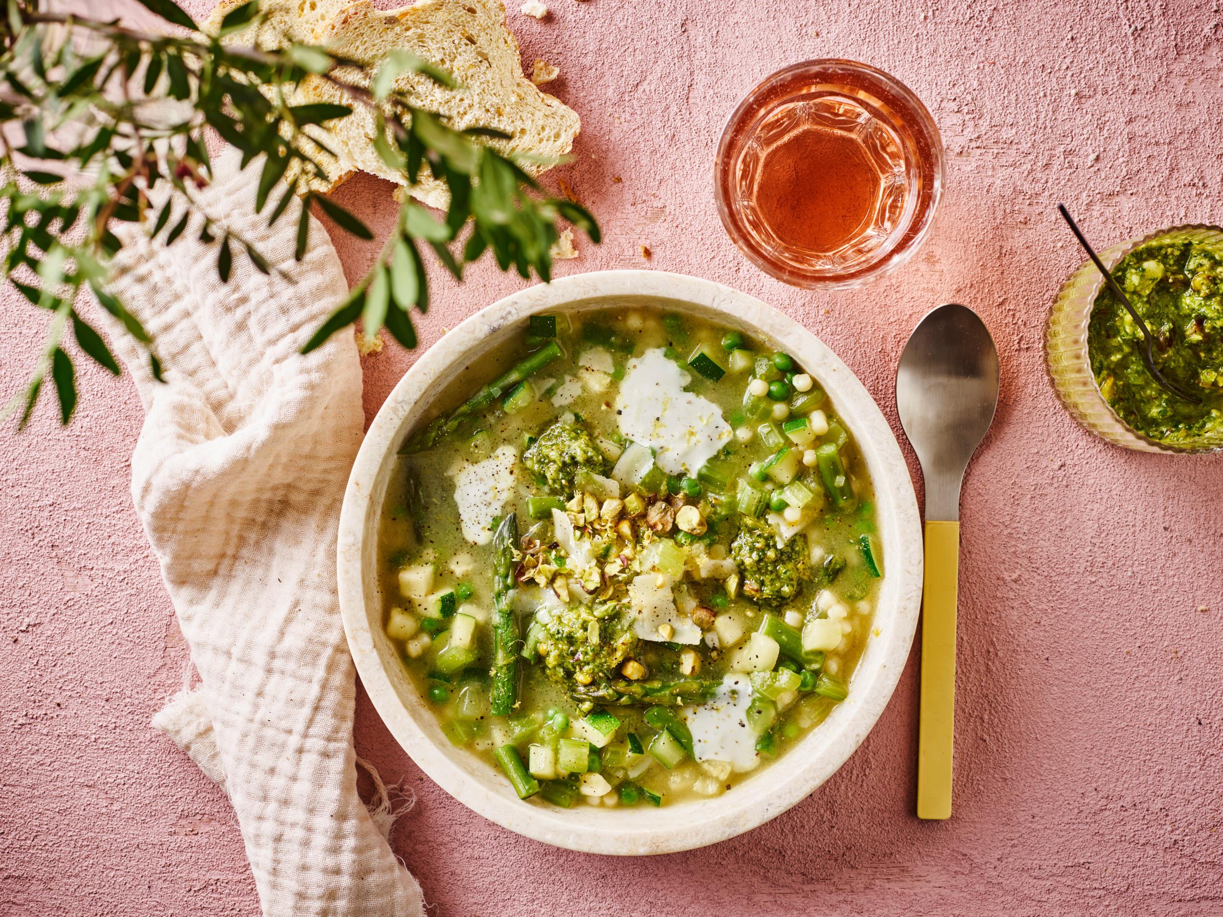 Een frisgroene minestrone met fregola – de pasta uit Sardinië (heb je die niet in huis, ga dan gerust voor parelcouscous). De pistachepesto voegt nog meer smaak toe aan het lentesoepje.