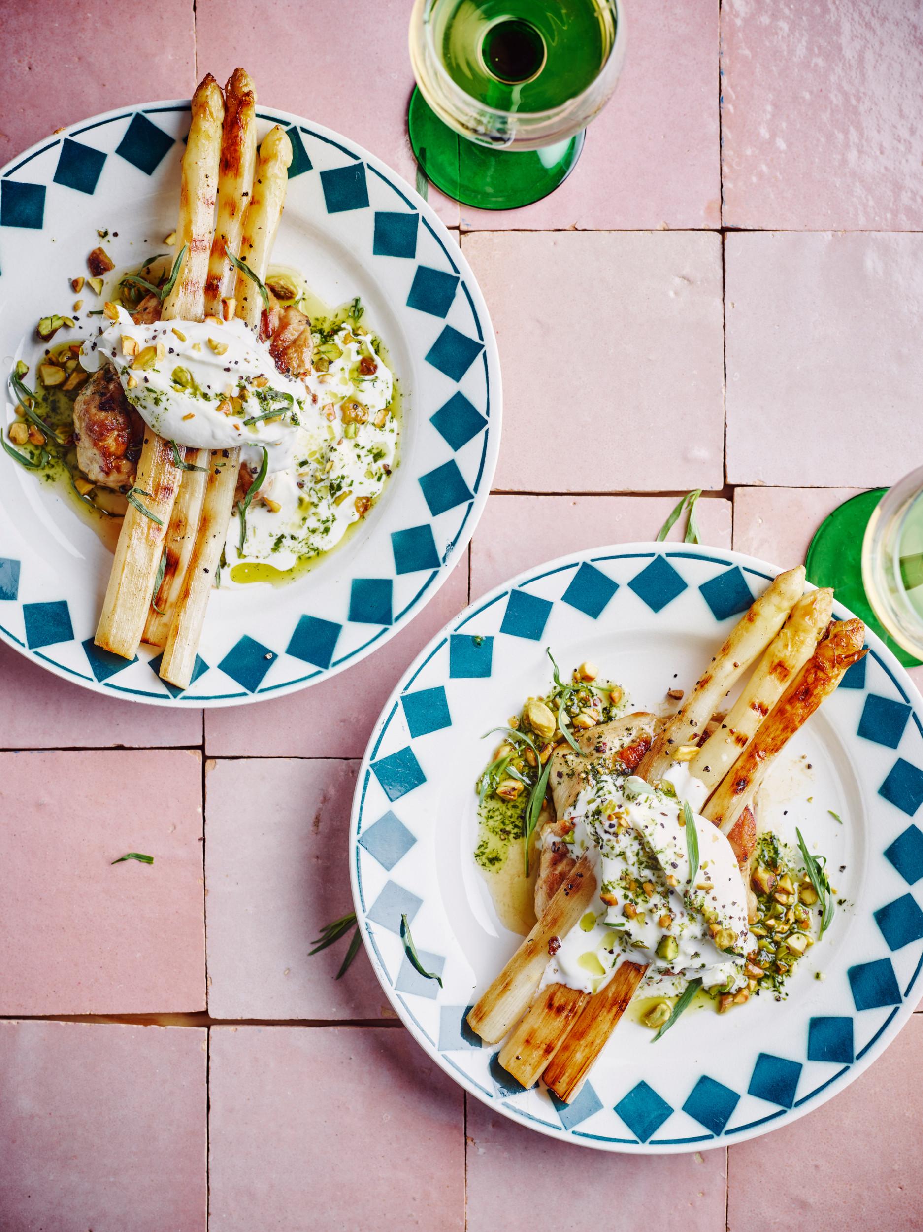 Een sappig stukje kip, frisse citroen, smeuïge burrata en wat zowat de populairste groente van het seizoen moet zijn… Een heerlijk bord asperges met pistachios als allesbepalende finishing touch.
