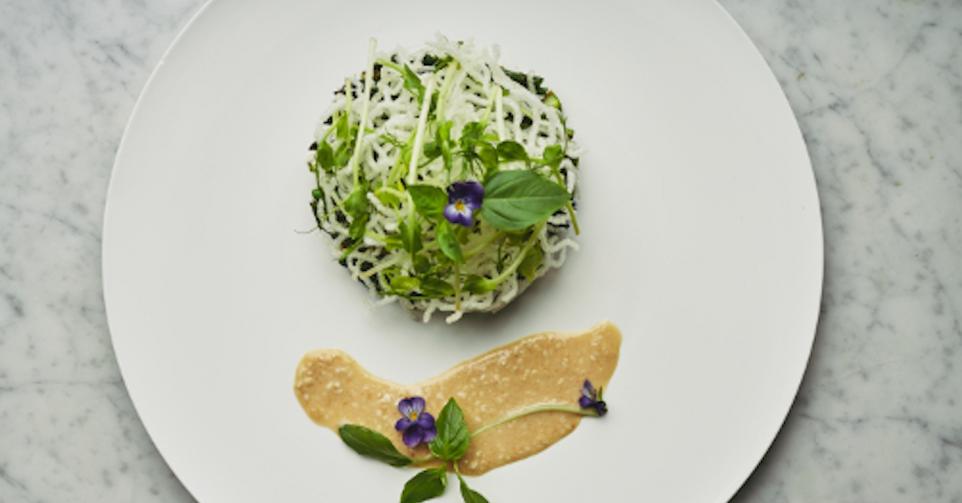 - Leg wat noedels in een diep bord. Leg daarop de asperges en schenk de dressing erover. Garneer met cress, erwtenscheuten of bloemetjes.