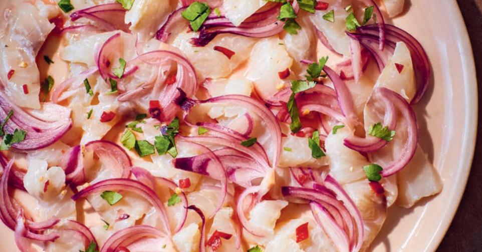 4. Schik de vis en de roze uien op een bord, schep de melkachtige citrusmarinade erover en bestrooi met de gehakte koriander. Schep een beetje van alles op een stuk kroepoek en schuif dit in je mond.