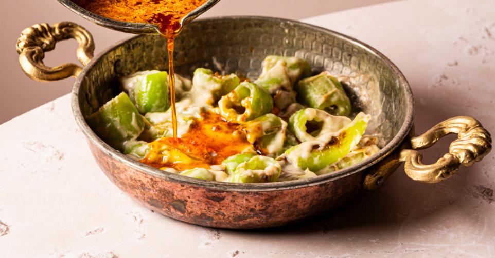 Hale Amus: ‘Een troostend ontbijtgerecht. Zoete en licht pittige pepers worden langzaam gekookt in melk en boter, waardoor ze zacht en weelderig worden. Het gerecht voelt eenvoudig aan, maar levert toch gezellige ochtendvibes op, vooral als het wordt opgeschept met knapperig brood.’