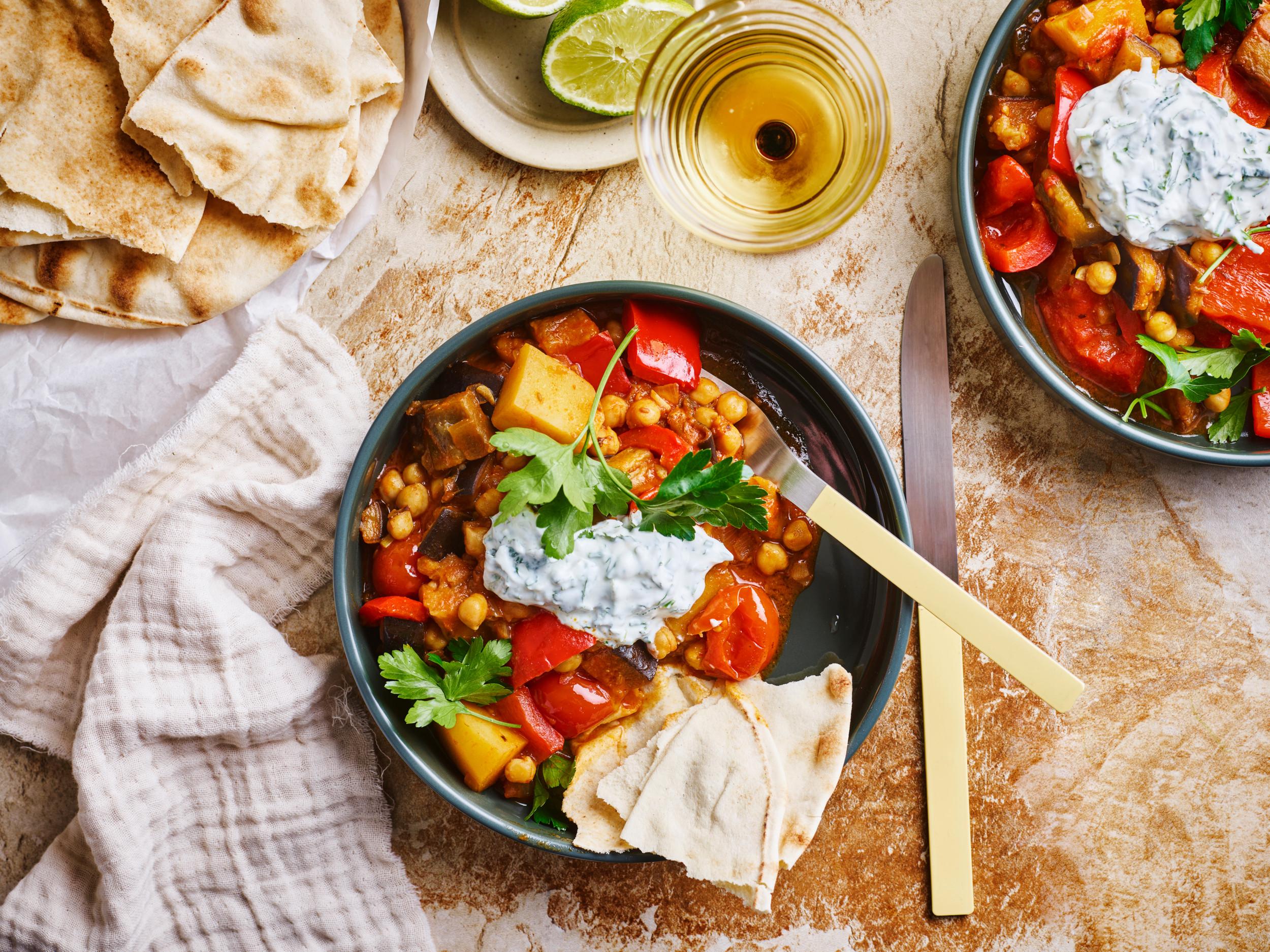 5. Auberginestoofpot met kikkererwten en groenekruidenlabneh