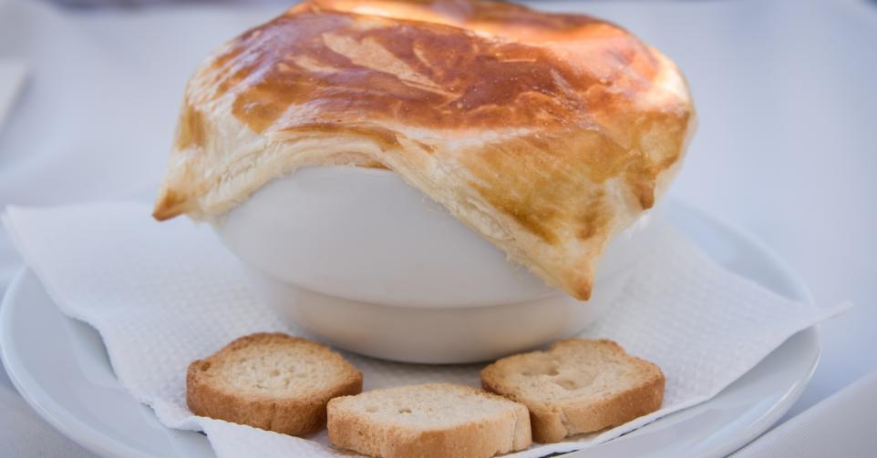 - De plakjes bladerdeeg met eigeel instrijken. Op iedere kom een deksel van bladerdeeg aanbrengen. De randen aandrukken en de kommen in een oven van 180°C plaatsen.