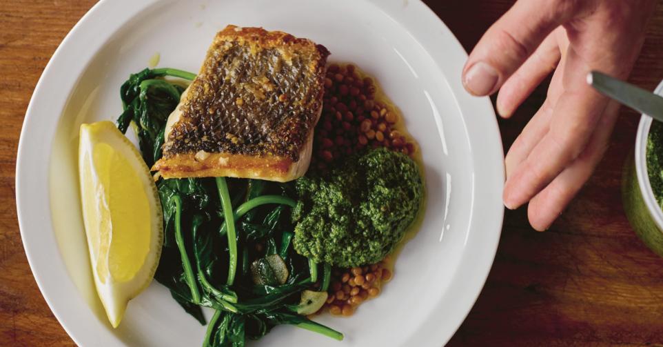 5. Schep de linzen en spinazie op voorverwarmde borden en leg daarop steeds een zeebaarsfilet met de huidkant omhoog. Maak het af met wat salsa verde (zie recept hieronder) en een partje citroen om uit te knijpen.