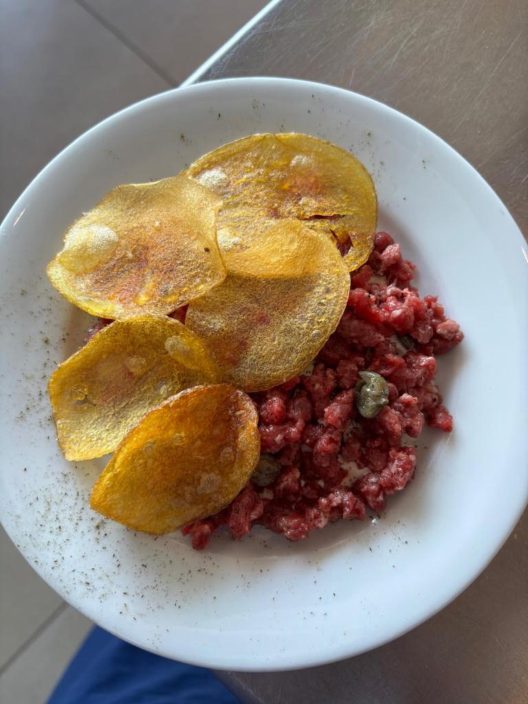 Voor Jasper Voet, chef en eigenaar van restaurant Furbetto in Heverlee, is het gebruik van aardappelchips een logische keuze. ‘De herinnering aan chips uit mijn jeugd, de ultieme verboden snack, is mij altijd bijgebleven. In het restaurant was het een haast vanzelfsprekende keuze om zoiets vertrouwds als chips als garnituur te gebruiken. We maken ze uiteraard vers en serveren ze dan bij onze rundstartaar. Die zintuiglijke ervaring van een goed gekruide tartaar op te lepelen met een krokant aardappelschijfje vind ik zelf nog altijd fantastisch.’