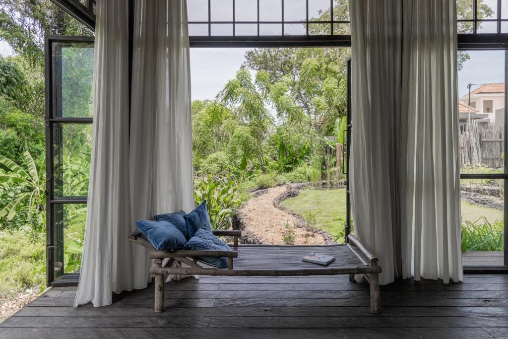Binnen in hun moderne interpretatie van een Balinese compound zetten David en Takami een toonbeeld van wabi-sabi neer. De schoonheid zit hem in de imperfectie, het patina, het zorgvuldig uitzoeken van de weinige stukken die de ruimte mogen innemen. Het linnen komt uit een atelier dat gescheiden vrouwen tewerkstelt die in Bali door de gemeenschap worden verstoten. De lampen werden lokaal gemaakt van bladvezels van de bananenboom, en ook de kunst aan de muren is inheems.