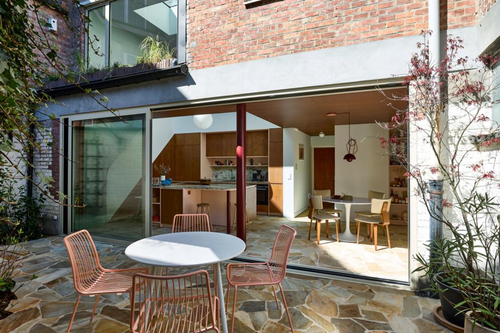 Nog meer verbinding: de mozaïek van lichtgetinte terrastegels loopt door tot binnen, waardoor de stadskoer onderdeel wordt van het interieur.