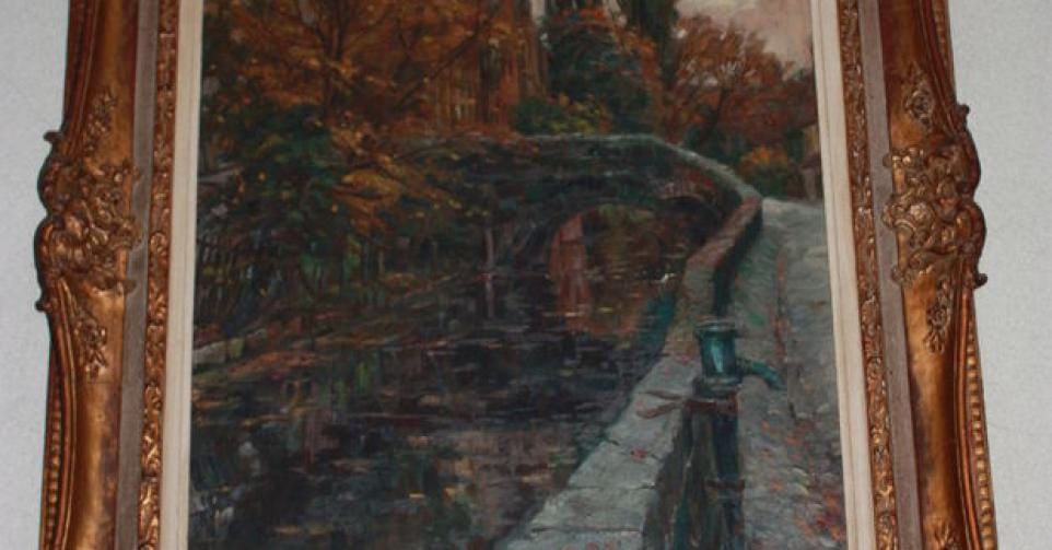 Wat de prijzen betreft voor de schilderijen van Lionel Poupaert vrees ik dat u niet goed bent geïnformeerd. De prijzen van de klassieke Brugse School zijn trouwens over het algemeen sterk gedaald. Dat geldt trouwens voor alle lokale schilderscholen. Maar de werken van Poupaert worden niet hoog gewaardeerd, hooguit een paar honderd euro. We schatten de waarde van dit tableau dat de Peerdebrug in Brugge voorstelt, op 250 euro.
