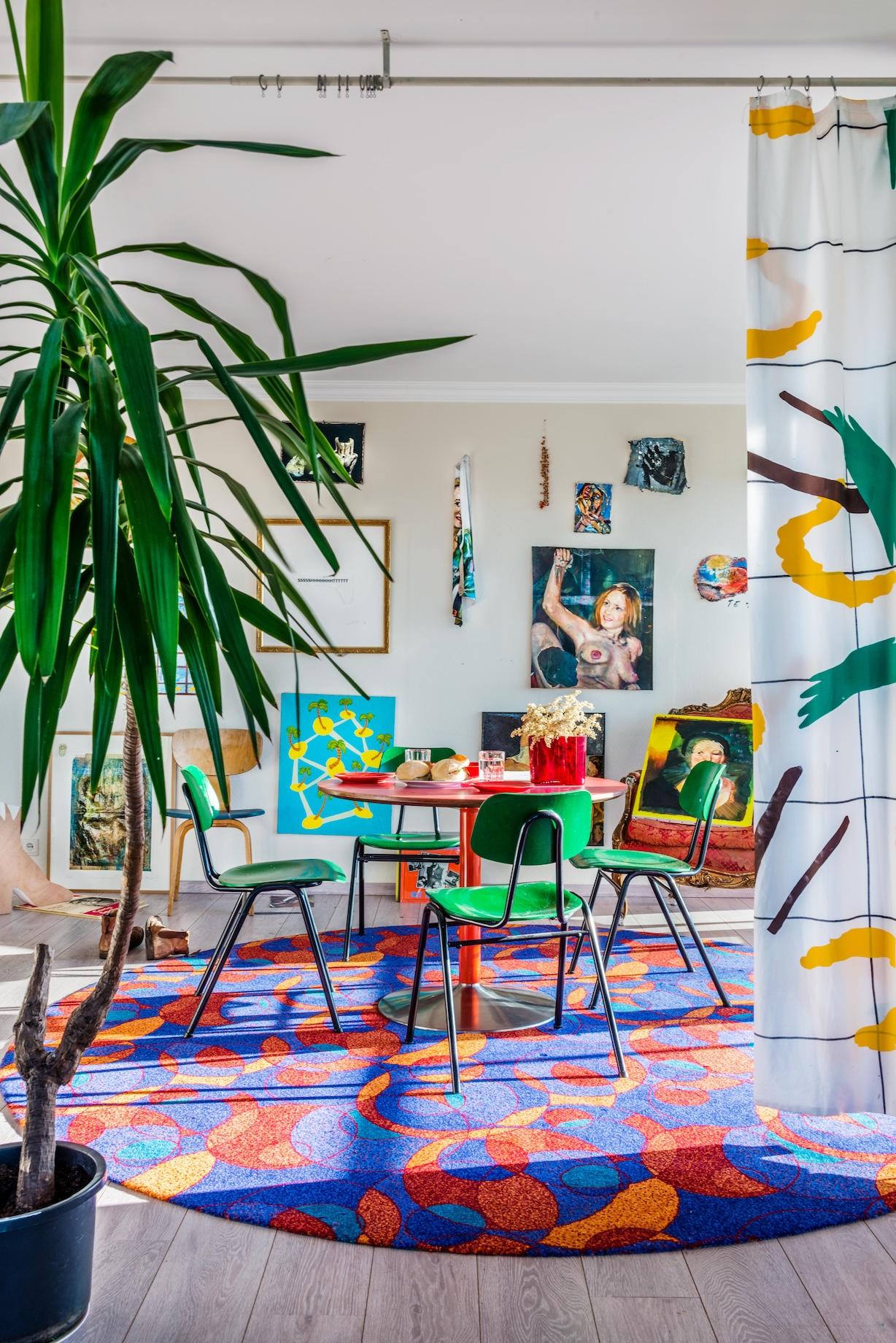 Neem een stel kunstenaars. Gun ze alle vrijheid in een woning, laat hun creativiteit een paar maanden borrelen en bruisen, en je hebt geen interieur maar een installatie. Zo woonden Matthieu Ronsse en Louise Delanghe in 2020 in een appartement op veertien hoog, in een van de woontorens aan het Gentse Spinmolenplein. Hoe ze verschillende kunstwerken en prints op gordijnen en tapijten combineerden, is kunst op zich.