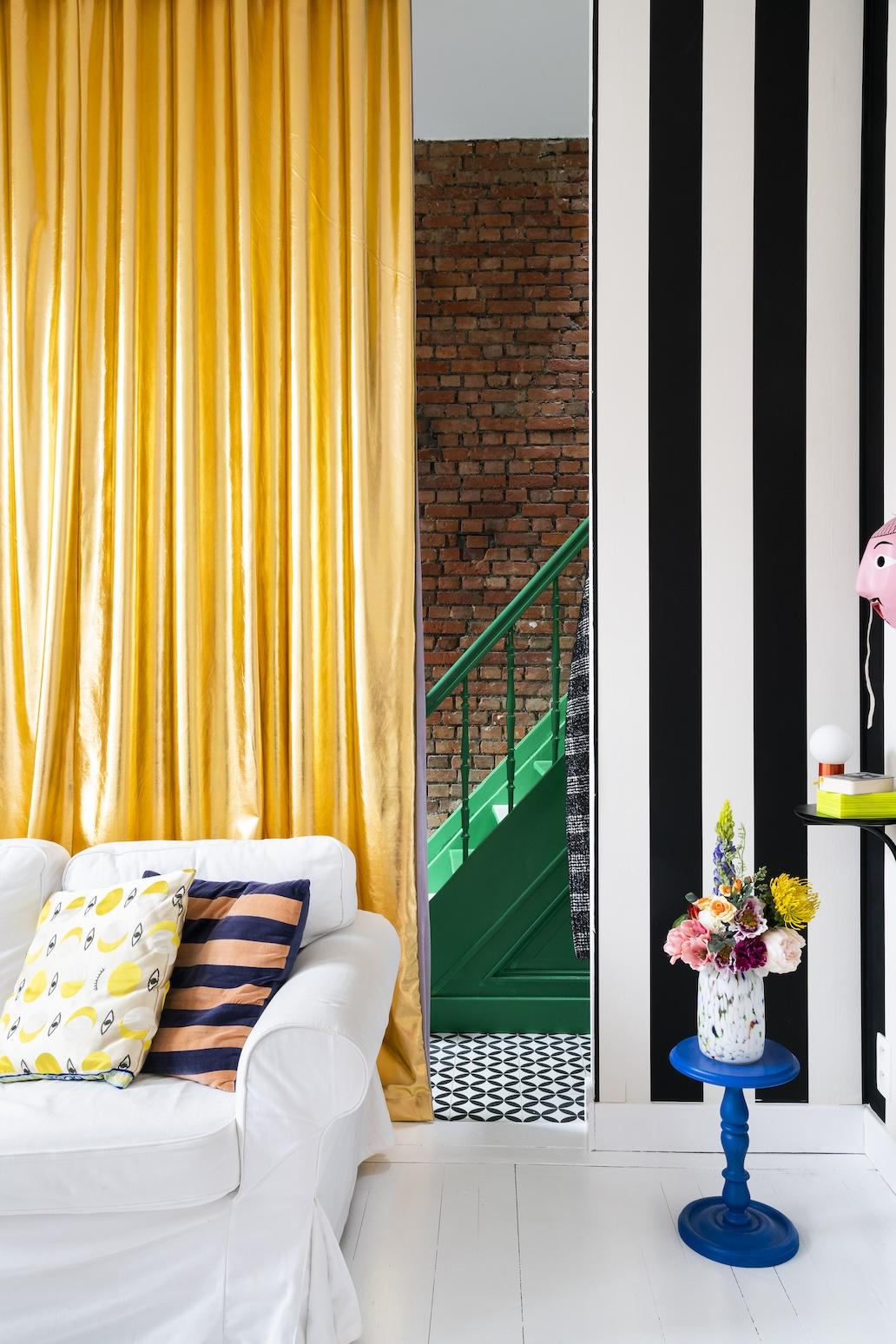 Ontwerpster Jasmien Witvrouwen ken je van haar juwelen met humor en ondeugende taal. Sinds ze in 2020 door het oog van de naald kroop, viert ze het leven. En dat vertaalt zich in een bijzonder vrolijk en uitbundig interieur met als blikvanger deze zwart-witte streepjesprint.