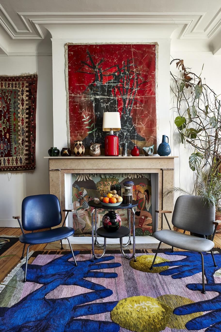 Hoewel er vooral stukken uit het einde van de twintigste eeuw te spotten zijn, bevat de flat van deco-influencers Loredana en Eliot ook ook een aantal prachtige hedendaagse objecten, zoals een indrukwekkend veelkleurig tapijt. Niet met een print deze keer, maar met honingraatgaatjes. Een unicum van de Japanse ontwerper Keisuke Shoda, van Studio The Blue Boy. ‘Het is een onuitgebracht prototype dat hij ons schonk omdat hij dacht dat het goed zou staan in ons huis,’ klinkt het.