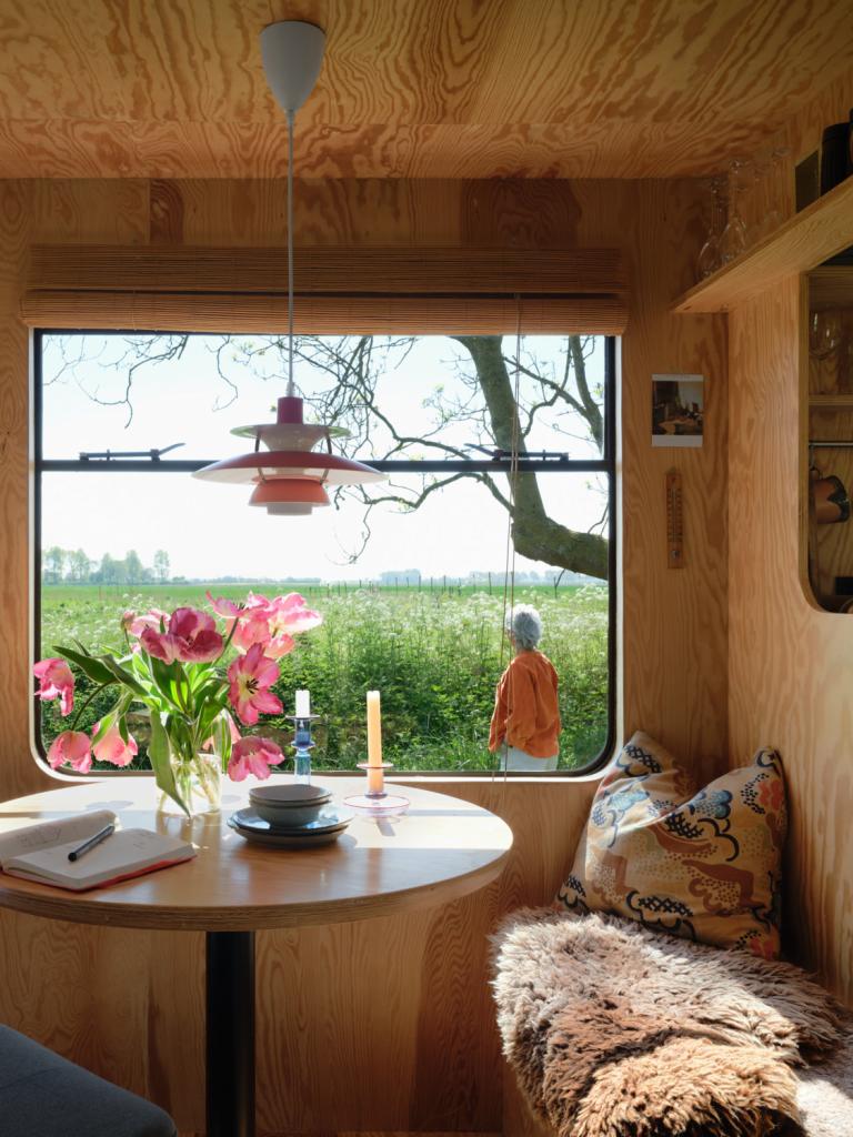 Weer voltijds in Brussel wonen en van daaruit de werf opvolgen, daar zag Kim tegenop. Ze had de regio ontdekt vanop een camping waar ze ’s zomers in een zilverkleurige Amerikaanse Airstream uit 1953 woonde. Ze had ook al een busje omgebouwd dat haar jaarlijks naar het Marokkaanse Essaouira bracht. Waarom zou ze zich deze keer niet aan een caravan wagen? ‘Ik ben helemaal gek op van die kleine ruimtes waar je tot het uiterste moet puzzelen.’