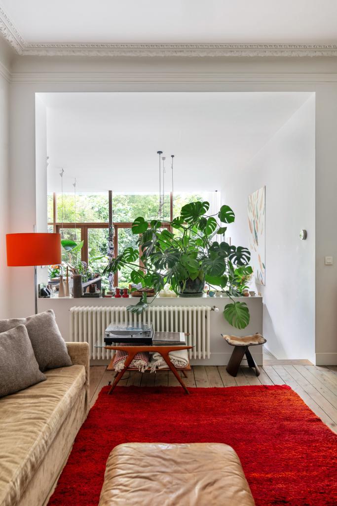 Karoliens groene vintage bankstel gaat al vijf woningen mee. De stof is niet meer origineel, die van de Relaxer van Verner Panton ernaast wel, al is die nogal verkleurd. ‘Ik had de bekleding nooit bij de donkere was mogen doen’, lacht ze.