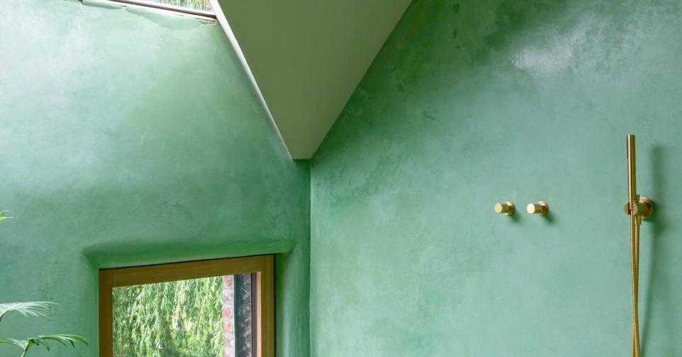 Bij de uitbreiding van een boerderij in Ninove schoven Objekt Architecten een nieuw volume in het bestaand gebouw. Geen vierkant deze keer, maar een parallellogram. Zo ontstond een driehoekig leitmotiev doorheen de woning, inclusief deze piramidale inloopdouche.