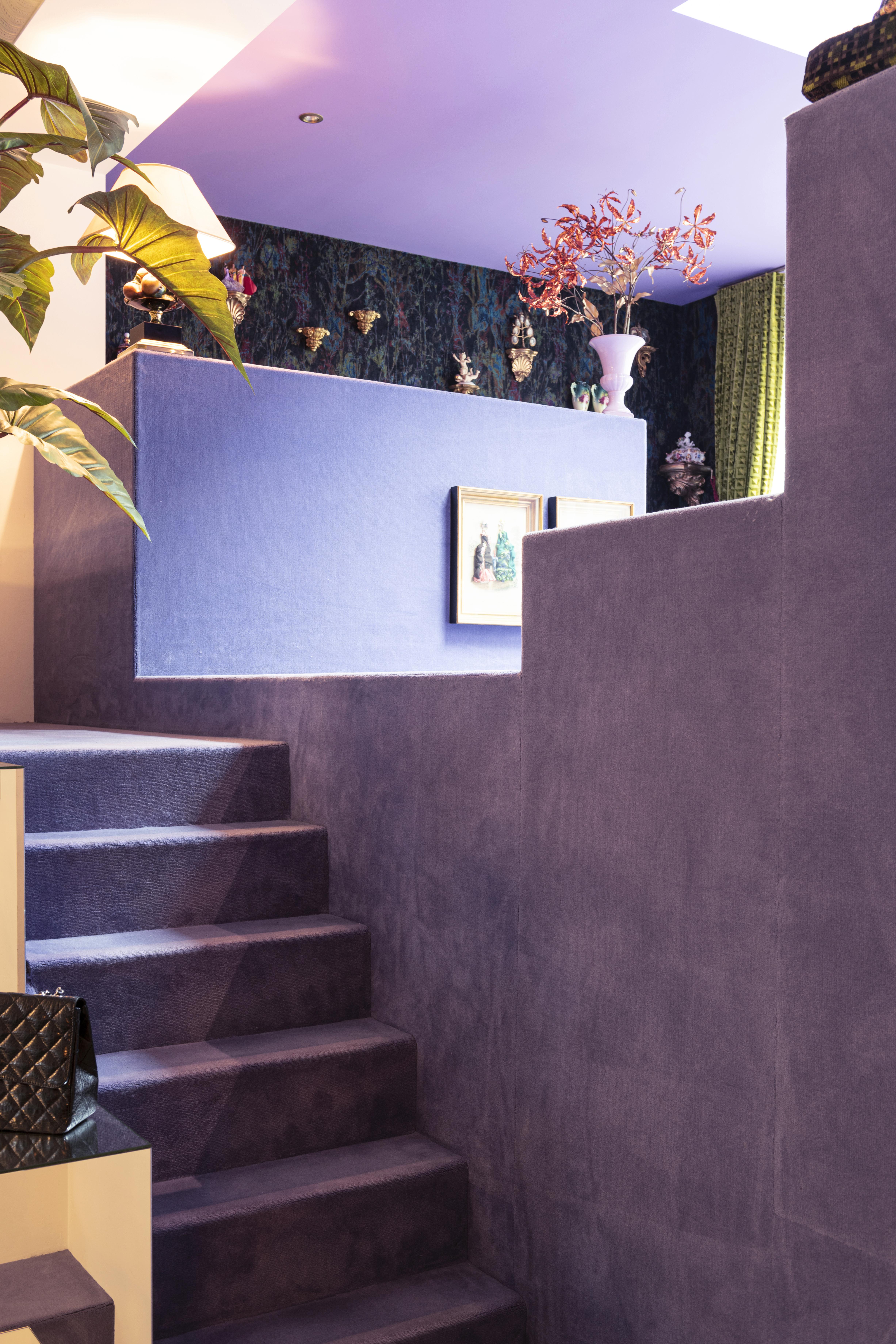 Jan Dendievel: “Het interieur is eigenlijk net klaar. Ik moest alleen nog bepalen welk tapijt ik achter en op de trap naar mijn home office wilde hebben. Daar heb ik jaren over gedaan, door alle werken die eraan voorafgingen.” Hij koos voor een paars dat dicht aansluit op de nieuwe Very Peri-kleur van Pantone. Geheel toevallig, want de tint spookte al negen jaar geleden door zijn hoofd. “Meer dan ooit maak ik bewuste keuzes. Ik wacht liever dan dat ik snel alles klaar heb.”