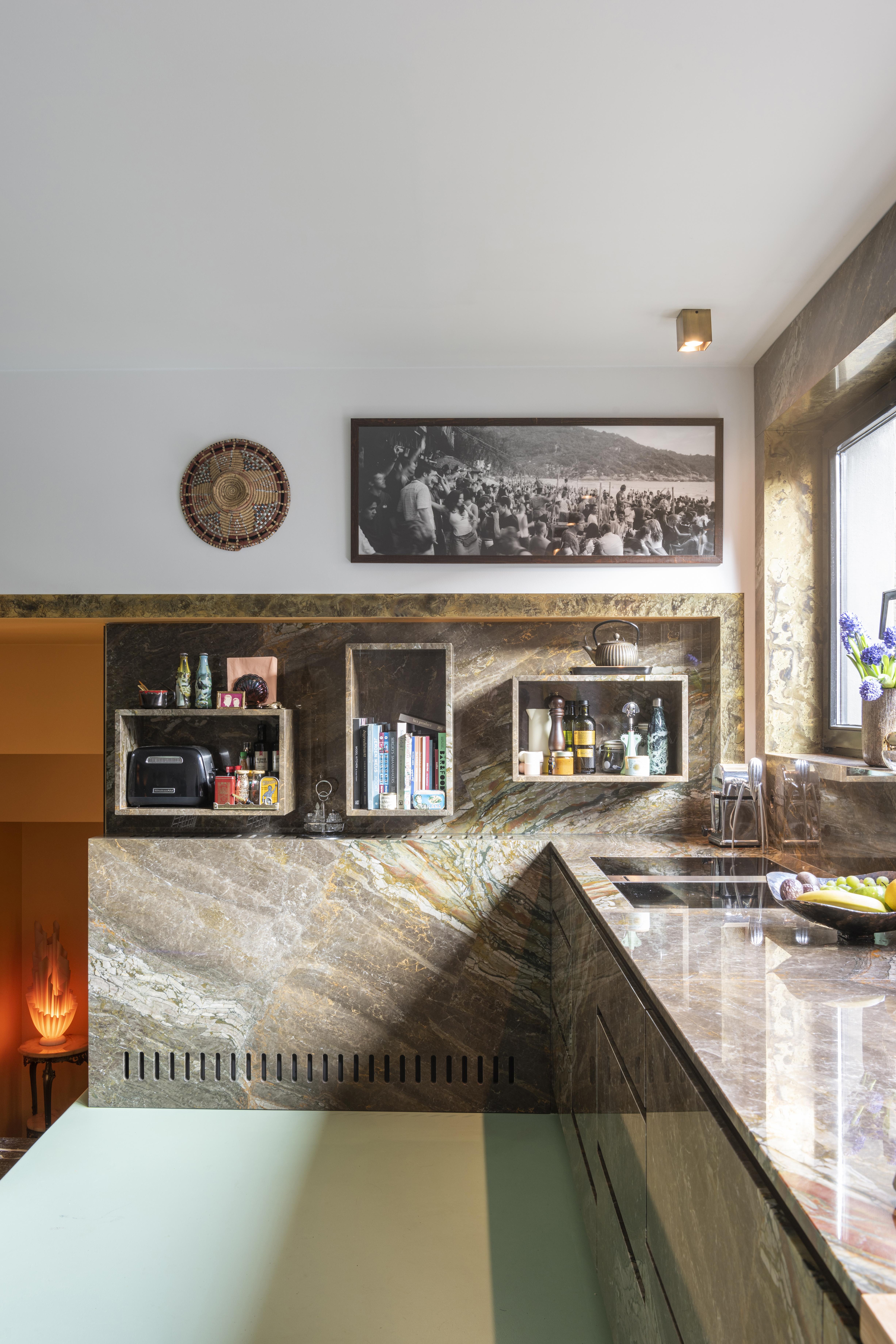 Jan trof het Funky Vision-interieur nog in bijnaoorspronkelijke staat aan. De vorige bewoners – een professionele dj en daarna een muziekproducer – hadden de toog intact gelaten, net als de dj-booth en de lichten. Daarvoor stond het meer dan vijftien jaar leeg. Het geheel oogde totaal uitgeleefd. Jan stripte het pand dan ook tot op het bot. “Elk jaar heb ik een onderdeel van het interieur aangepakt. Eerst kwamen de voor- en achtergevel aan de beurt. Die heb ik voorzien van nieuwe raampartijen zodat er meer daglicht binnenkwam. De breukstenen vloer kwam in het tweede jaar, daarna de veertien meter lange consolekast in een Indisch appelhout dat je ook op de muren van de inkomhal ziet.” Zijn lila spiegelpaleis en lichtblauw gelakte slaapkamer gingen de keuken en de oranje badkamer voor. “Een voormalige danceclub verbouwen, dat vraagt wat tijd en creativiteit”, glimlacht hij. “En geld.” Het grootste deel van zijn budget ging op aan de opvallende vloer. “Ik heb zelf de blauwe steen kapotgeslagen en samen met een tegelzetter gelegd, met dit als eindresultaat. Ook al lijkt de vloer vrij willekeurig te liggen, er is een mooie balans gezocht én gevonden tussen de grote en kleine stukken.”