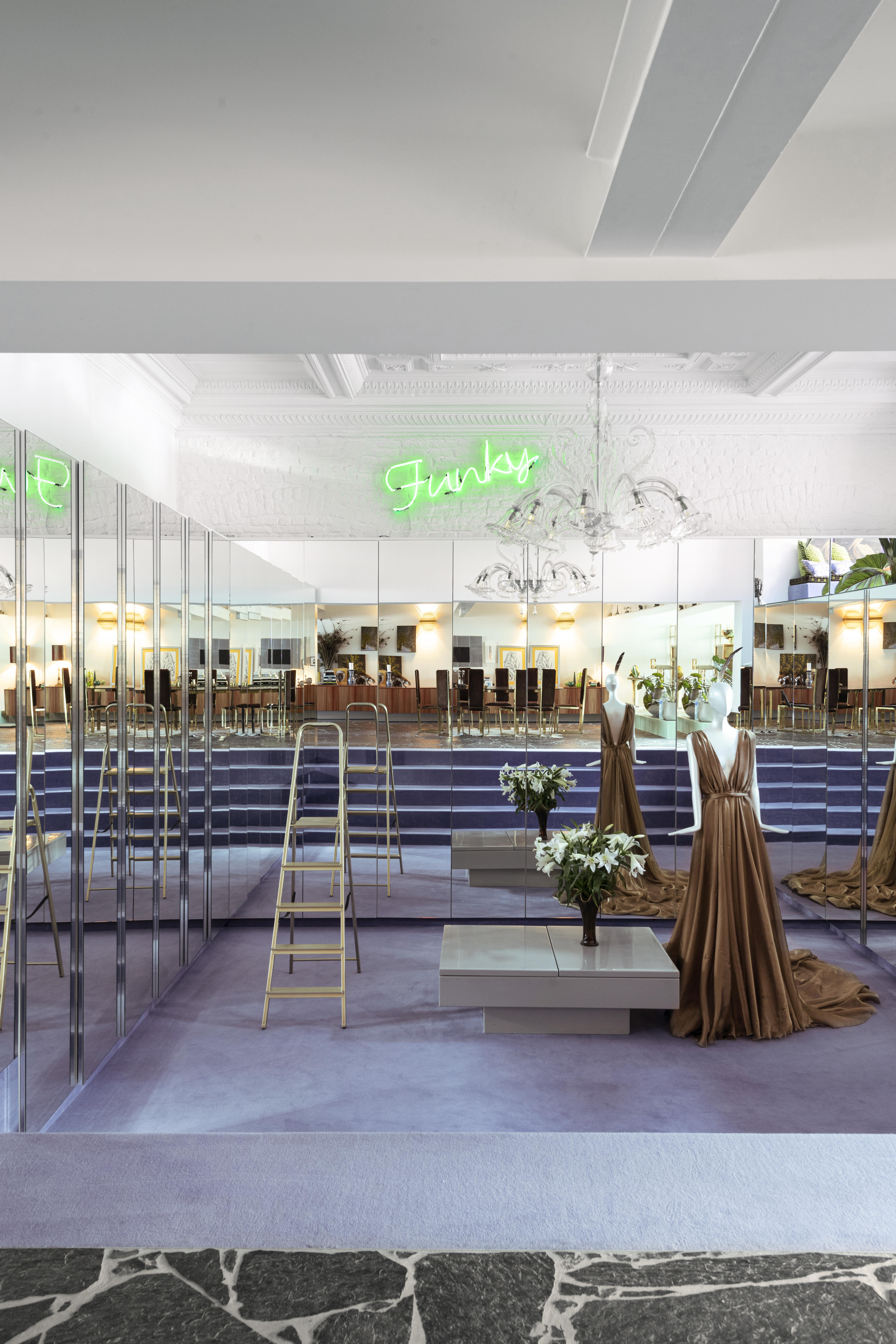 Het is op die plek dat Jan Dendievel zijn intrek nam, negen jaar geleden. De gevel was toen nog overladen met muurschilderingen en neonreclame die om de paar seconden van rood naar blauw knipperde. Hij viel voor het bijzondere appartement vanwege de vele niveauverschillen en de ruimtes die doorheen twee opengebroken herenhuizen lopen. Waar gasten vroeger in mooie ronde zitnissen plezier maakten, richtte hij zijn woonkamer in. De bar verving hij door een keuken in Pocahodas-marmer, rondom de oude dansvloer staat nu een indrukwekkend spiegelpaleis dat dienstdoet als pasruimte en dressing. Niet alleen voor hem persoonlijk. Onder de naam La Tirette is Jan namelijk al jarenlang actief als stylist voor magazines, televisie en film. Zijn laatste wapenfeit zal volgende zomer te zien zijn in de bioscoopzalen: de langverwachte film The Emperor, waarin de Amerikaanse acteur Adrien Brody in de rol van Keizer Karel kruipt.