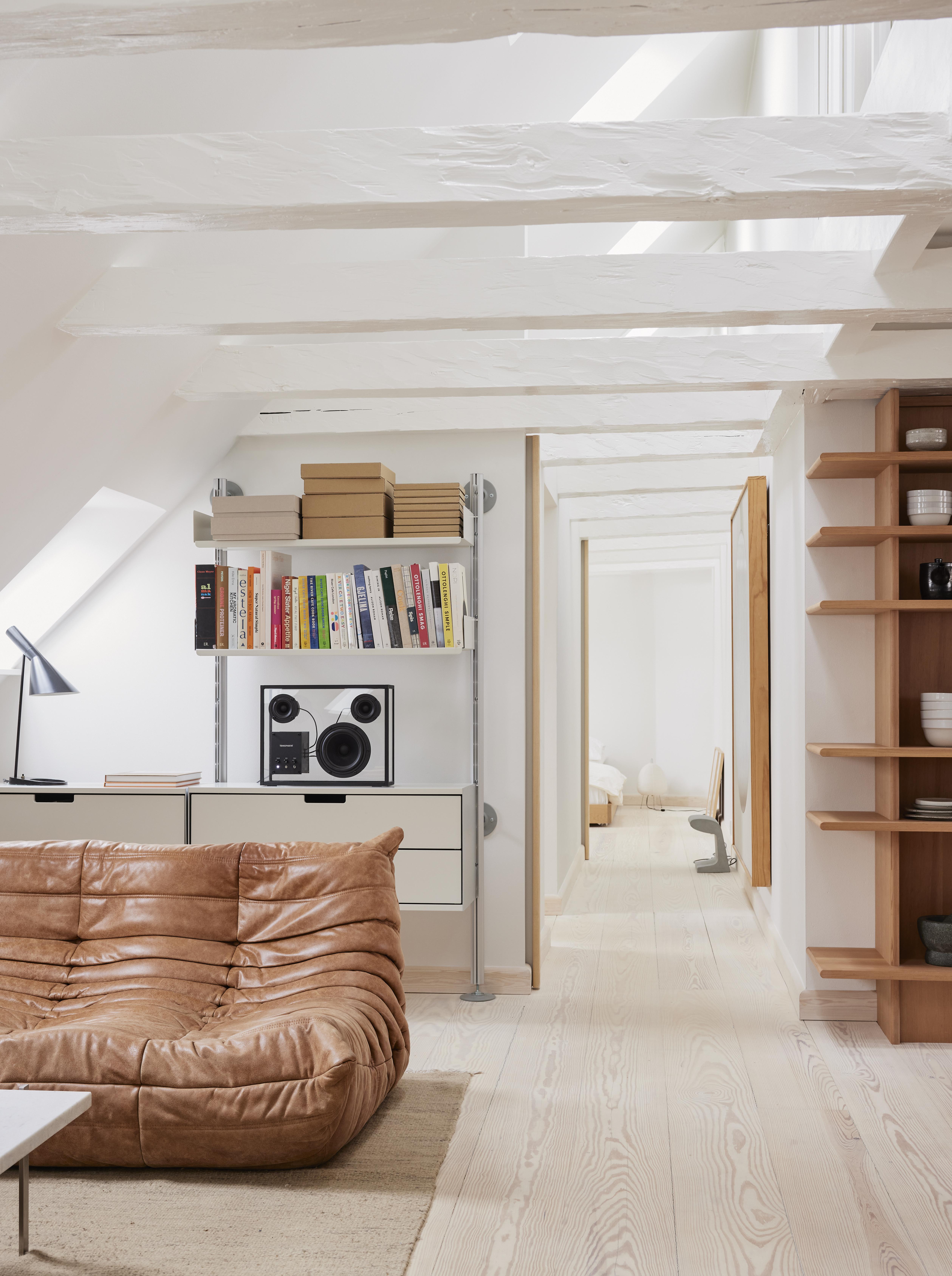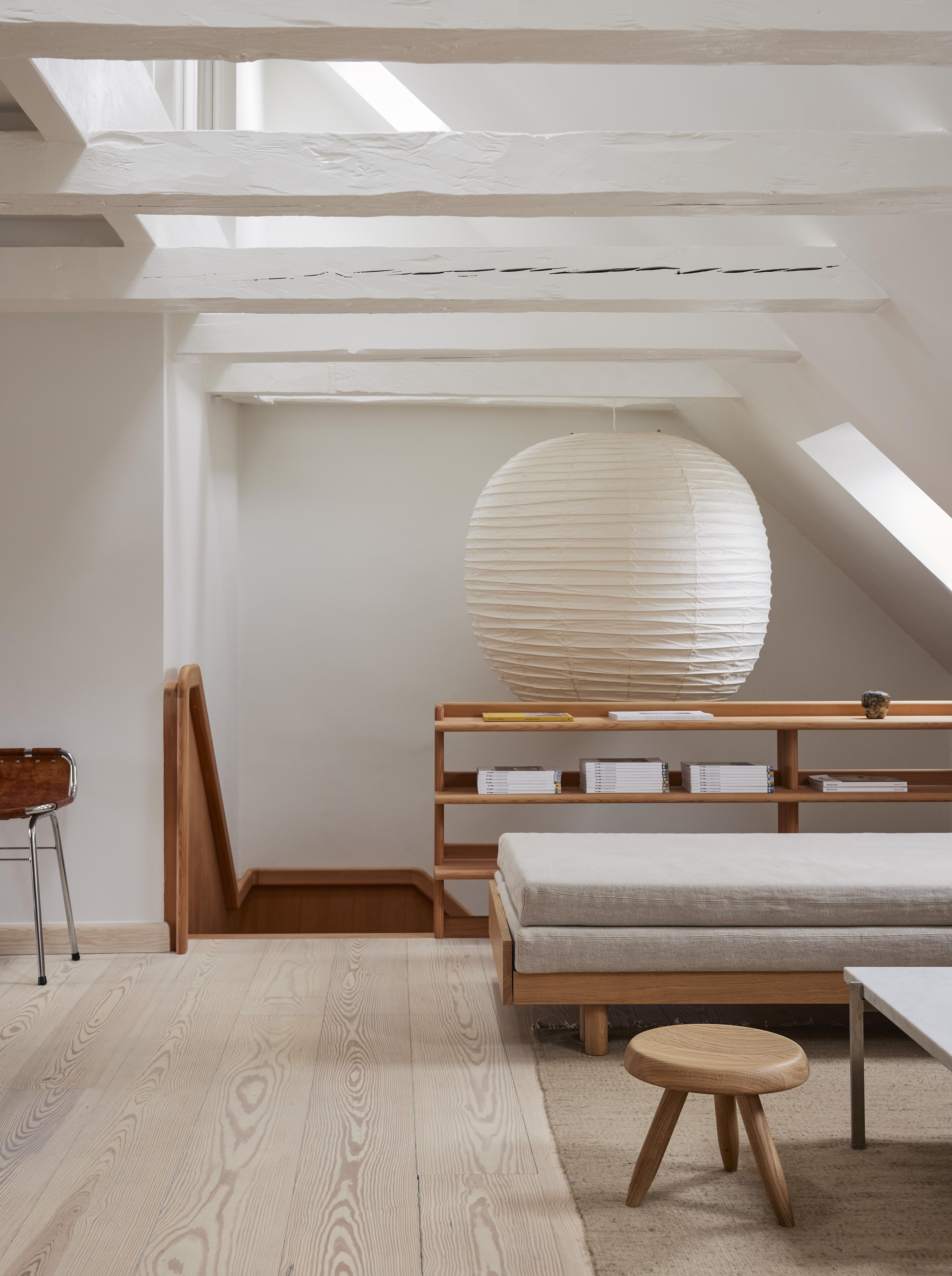 Zo kwamen ze terecht in Grønnegade, de oudste buurt van Kopenhagen, bekend om haar cafés en levendige sfeer. Het appartement zit in de voormalige droogzolder van een vroeg-achttiende-eeuws pand dat uitkijkt op een goed verstopte, rustige binnenplaats. Het licht stroomt gul binnen, de houten balken en trappen bleven bewaard en de plafonds wisselen af tussen hoog en laag. Omdat de twee verdiepingen een grondige renovatie konden gebruiken, schakelden ze hun vrienden in – Louise en Marcus Hannibal Sigvardt van het New Yorkse Bunn Studio.
