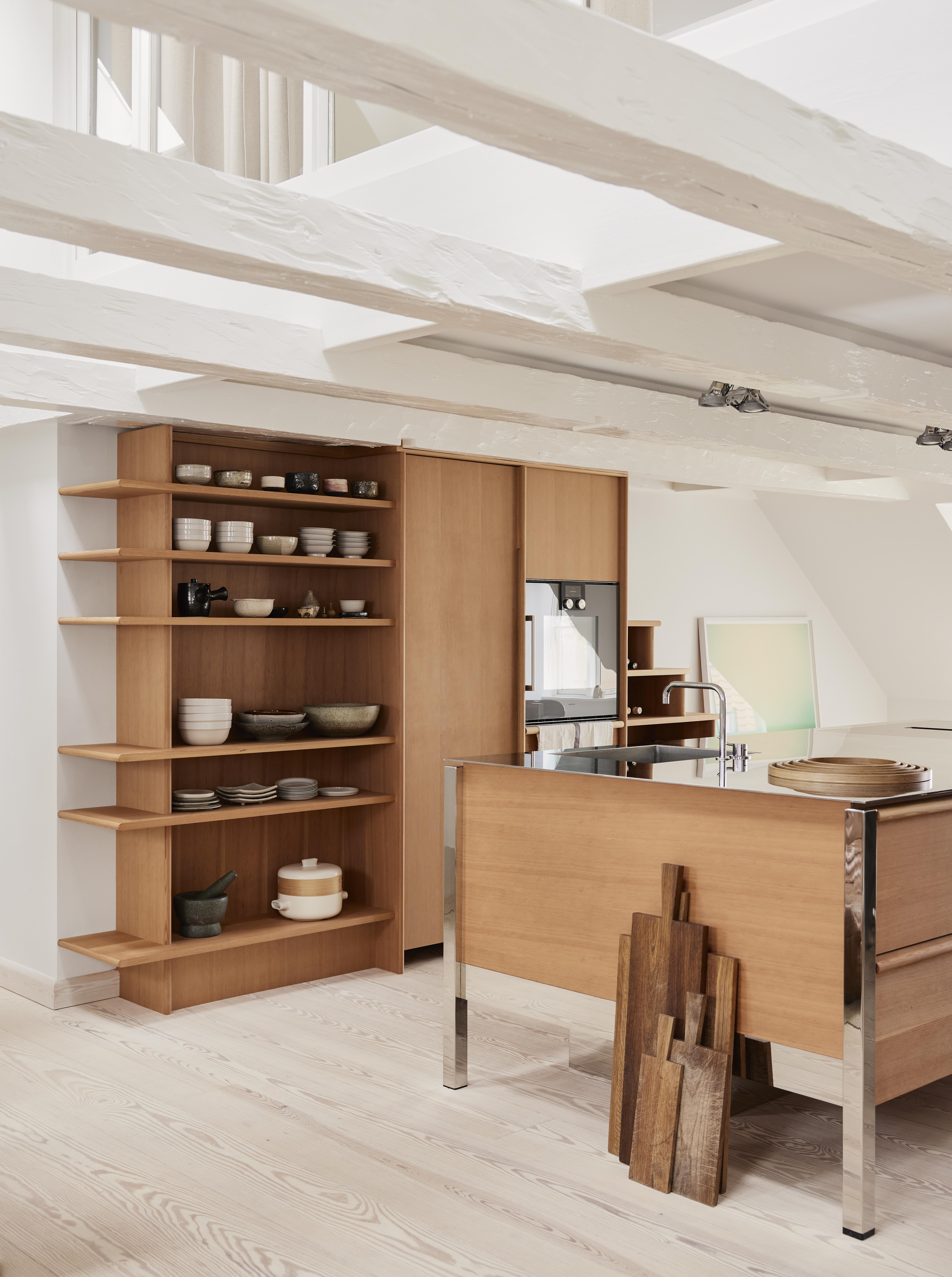De open leefruimte met keuken en woonkamer vormt het episch centrum van hun huis. ‘We brengen er veel meer tijd samen door dan vroeger’, aldus Nordsøn. Ondanks de compacte oppervlakte ontvangen ze hier geregeld vrienden. Het kookeiland werd daarom extra breed ontworpen. Het is de plek geworden waar iedereen rond samenkomt. ‘Door het gepolijste roestvrij staal werd het een monoliet die de ruimte weerspiegelt en ’s avonds voor een magische sfeer zorgt. In combinatie met hout krijg je warmte en textuur. Het voelt tegelijk licht en zwaar’, legt Bunn Studio uit. ‘Dat was ook ons uitgangspunt: invloeden combineren tot meerdere betekenislagen.’
