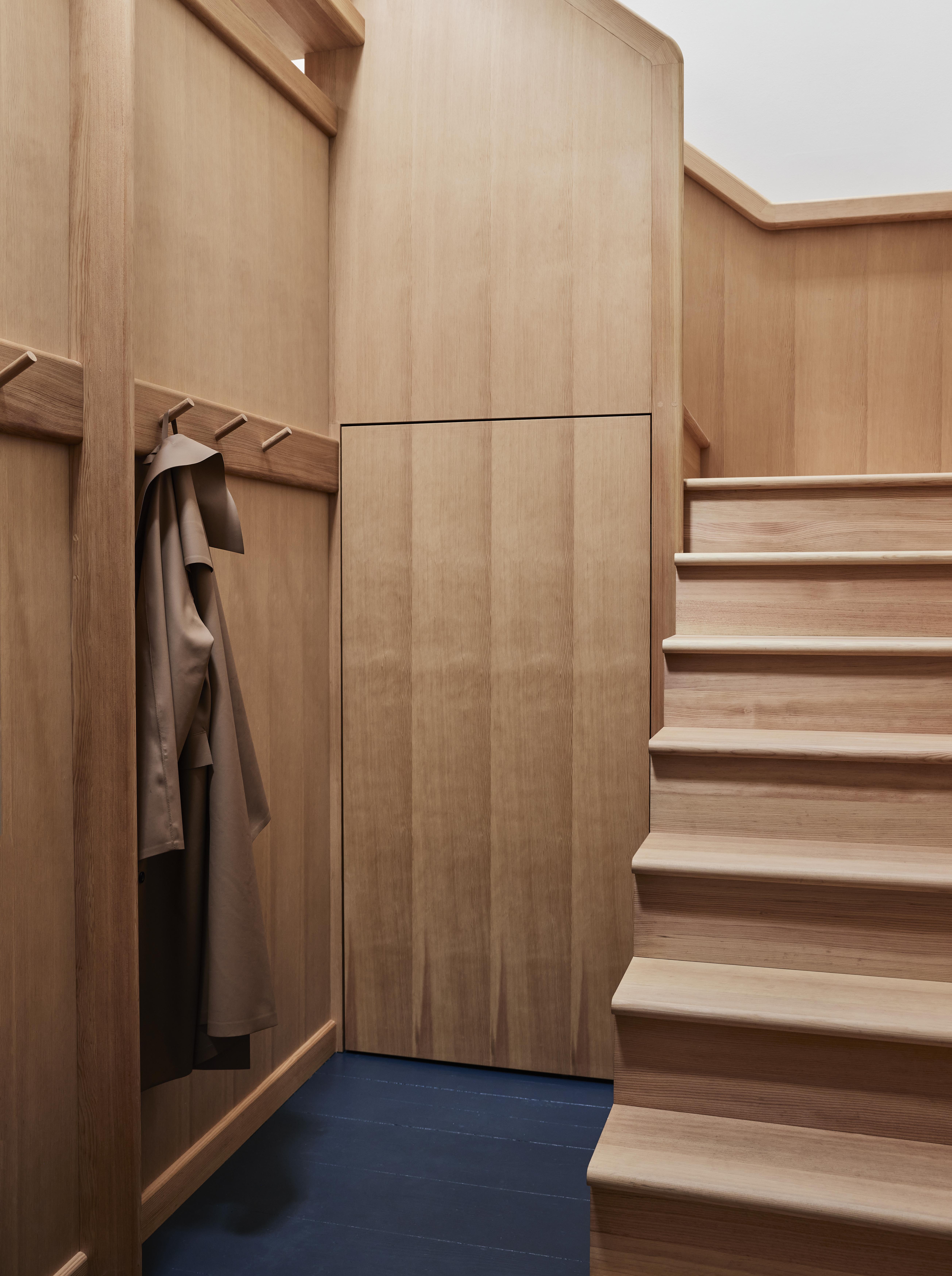 Het was het cruciaal dat ze zouden werken met hout, dat doorheen de jaren natuurlijk zou verkleuren. ‘Eikenhout zie je tegenwoordig overal, het dreigt een cliché te worden’, verklaart Bunn Studio. ‘Daarom kozen we voor Oregon Pine dat oorspronkelijk uit Noord-Amerika komt. Deze houtsoort heeft die warme, oranjeachtige, aardse gloed die je hier minder ziet. Daarnaast werkten we met geolied, geelachtig essenhout, om een mooi contrast te creëren.’