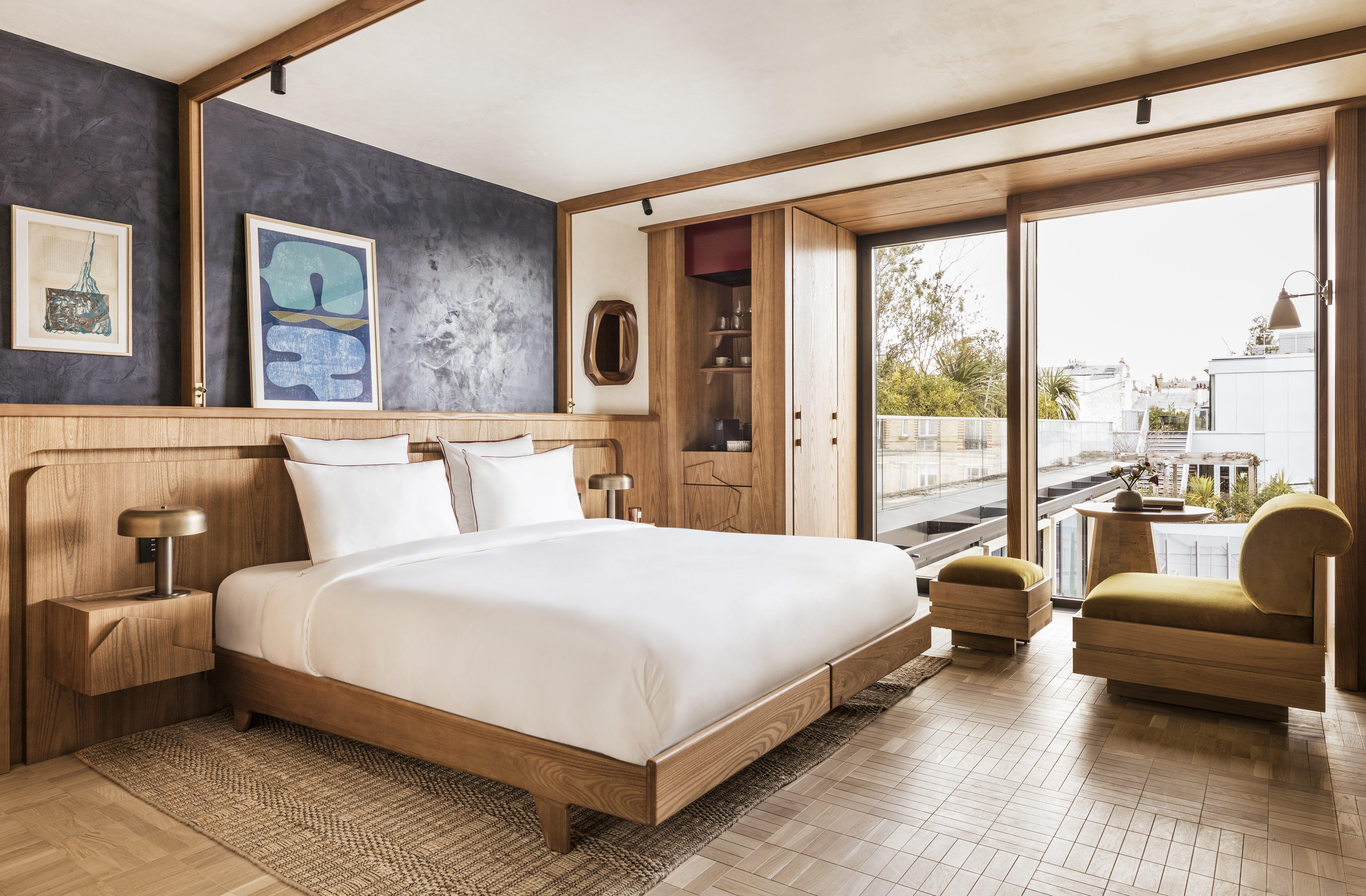 Het hotel opende drie maanden geleden, na zeven jaar renovatie, maar voelt al als een vaste waarde in de Parijse hotelsector. Dat komt ongetwijfeld door het interieur en de uitstraling van deze plek. Designers Robin Standefer en Stephen Alesch – van de gerenommeerde New Yorkse studio Roman & Williams – stonden in voor de warme, tijdloze sfeer. Elk meubelstuk en kunstwerk kwam met vakmanschap tot stand. We betrappen ons erop dat we elk object willen aanraken, van een kunstzinnig beschilderd luik, tot het botermesje bij het ontbijt, alsof je zo het vakmanschap beter kan voelen.
