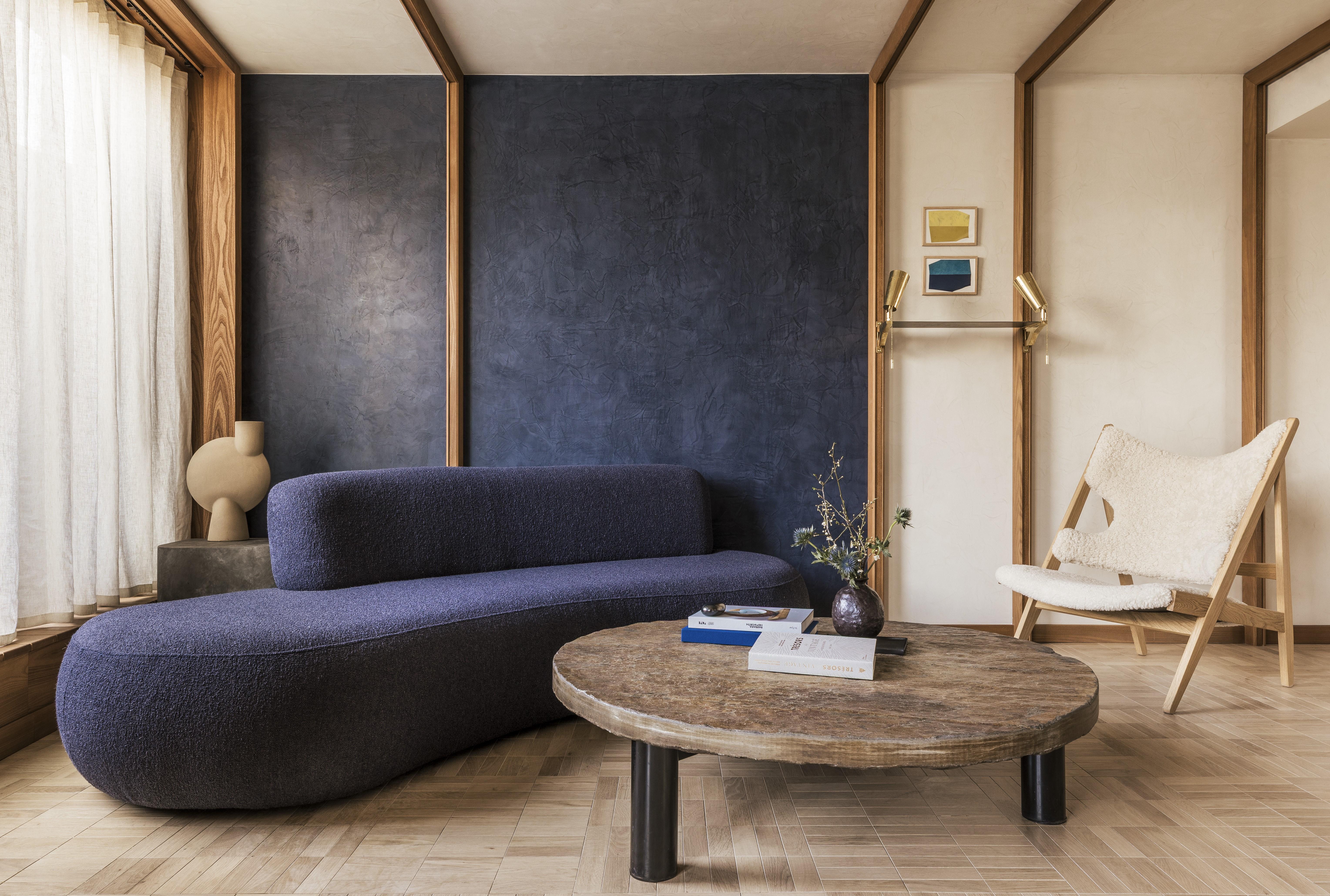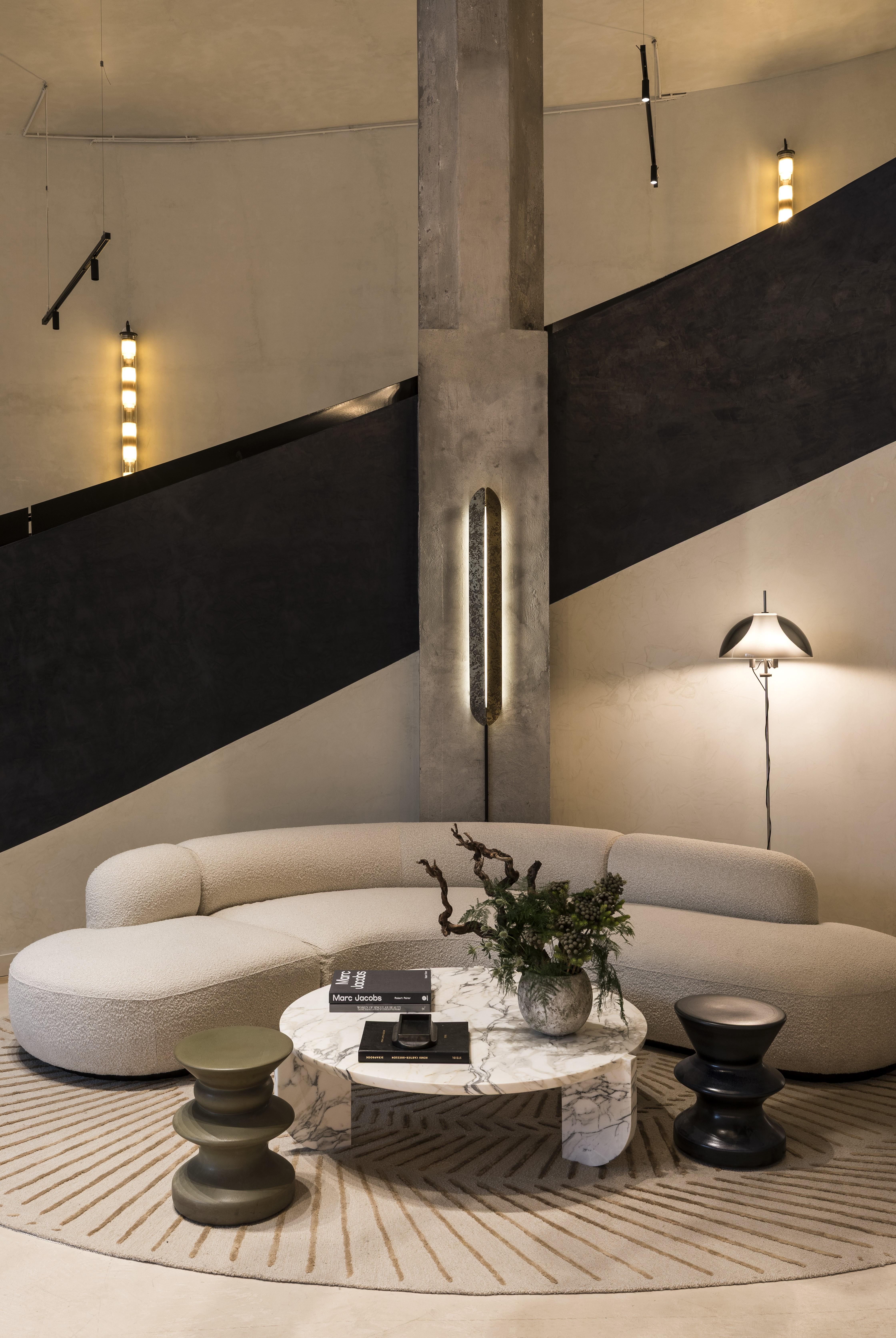 Een deel van dit gebouw was vroeger een openluchtparking en de betonnen spiraalvormige hellingbaan waar vroeger auto’s op- en afreden, werd behouden. Vandaag is het een grote trap die het hotelgedeelte onderscheidt van de kantoorruimtes die dieper in het gebouw liggen. Dat de overgang tussen verschillende ruimtes zo vloeiend, intiem en levendig tegelijk is, is duidelijk Roman & Williams’ signatuur.