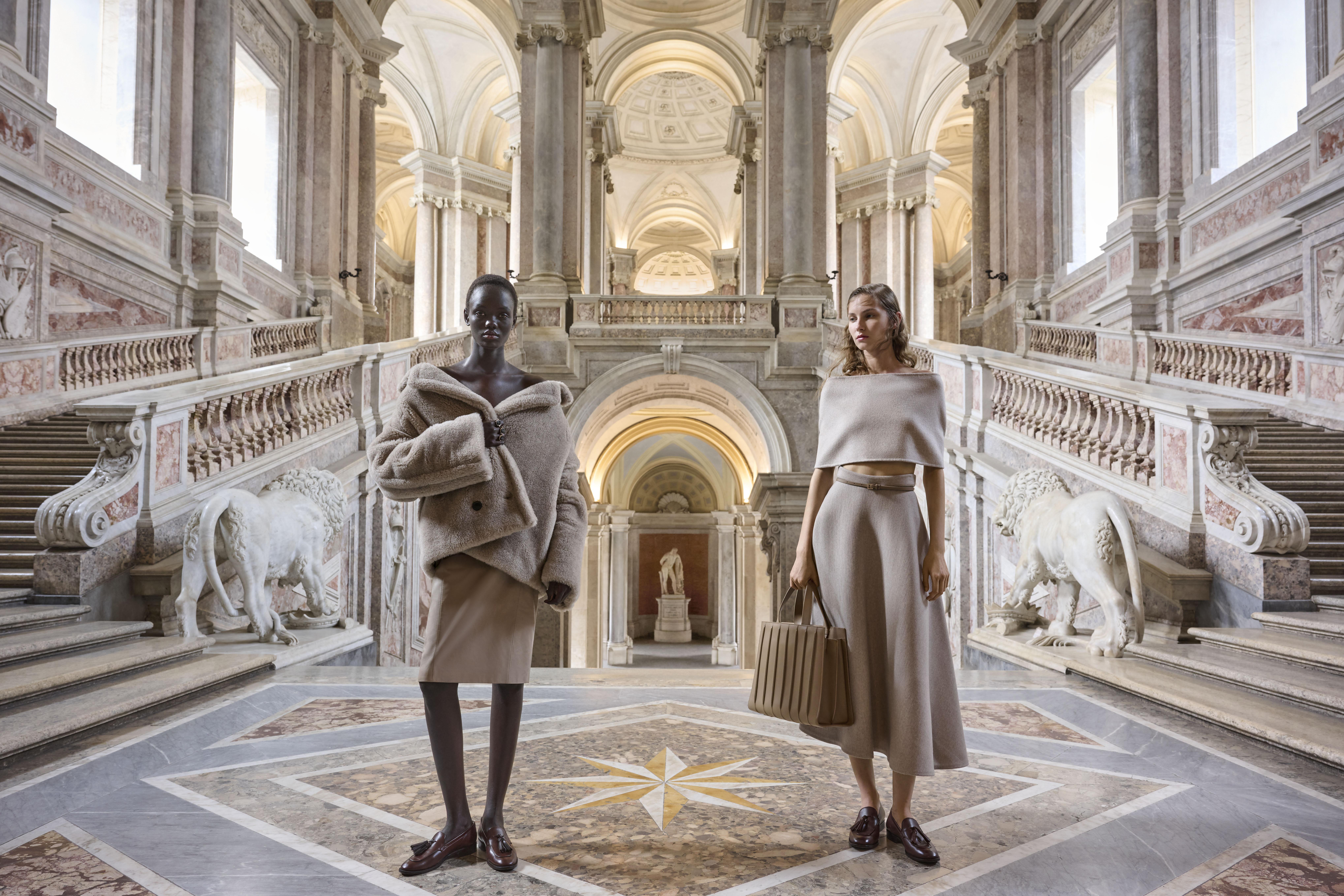 Die show vond plaats in het imposante Paleis van Caserta, even ten noorden van Napels, en opende met een sexy versie van het driedelige pak – jasje, korte broek en bustiertop – gecombineerd met een hoed en leren laarzen, allemaal uitgevoerd in Max Mara’s kenmerkende camelkleur. De kostuums waren volgens Griffiths ‘luchtiger en soepeler’ gemaakt, in samenwerking met de Napolitaanse kleermaker Vincenzo Cuomo. Een tweede lokale samenwerking was die met E. Marinella, waarbij prints uit het archief van de dassenfabrikant werden herwerkt tot playsuits en lange rokken.
