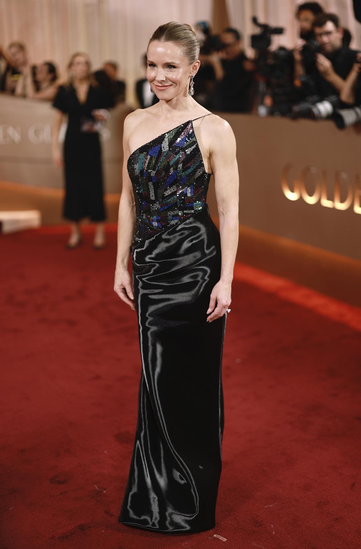 Ook bij de vrouwen was zwart favoriet. Blazy zorgde als creatief leider van Chanel voor de custom looks van Ayo Edebiri, Selena Gomez en Rose Byrne. Voor Edebiri en Gomez werkte hij met zwart fluweel en klassieke rode-loper-snits. Byrne verscheen in flessengroene zijde, een vintage silhouet dat deed denken aan de iconische groene jurk van Keira Knightley in Atonement.