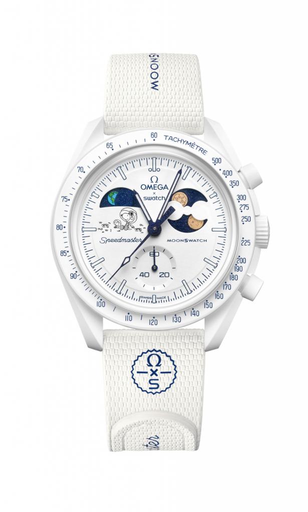 Dit nieuwe horloge is uitgevoerd in winters wit en heeft dezelfde wijzerplaatindeling als zijn voorgangers, inclusief de aardfase-innovatie van Swatch en een maanfase-indicator versierd met Omega’s Moonshine Gold. Onder de aardfase-indicator staat een illustratie van Snoopy en Woodstock op de maan. Alle wijzerplaten in de collectie zijn voorzien van het Omega X Swatch-logo, het iconische Speedmaster-logo en het MoonSwatch-logo.