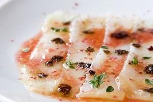 Ceviche van gerookte heilbot met bloedsinaasappel, roze peper en zwarte olijfolie