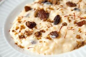 Rijstpap met rozijnen en bruine suiker