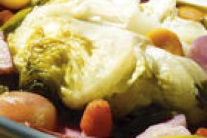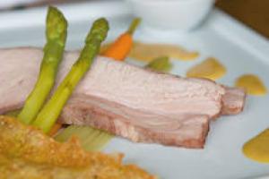 Varkenshaas met jonge wortelen en erwten, lente-ui en munt