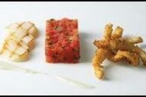 Fris taartje van gemarineerde tomaat, gegrilde coquilles, gefrituurde inktvis en sherrymayonaise