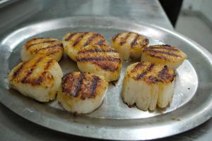 Gegrilde sint-jakobsnoten met bospaddenstoelen, gewelde botersaus met sojasaus en carpaccio van jakobsnoten en Parijse champignons