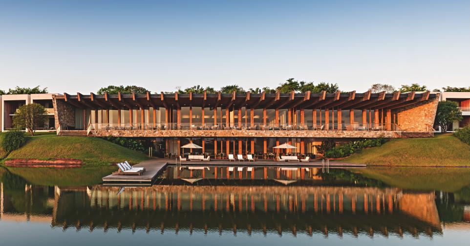 Met de strakke, modernistische lijnen van architect Isay Weinfeld contrasteert het gebouw bewust met de omliggende natuur. Dat spanningsveld wordt verzacht door het gebruik van duurzame materialen en een sober, minimalistisch interieur, waarin alle aandacht naar het landschap rondom gaat.