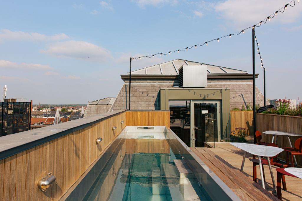 ‘We willen inderdaad ook families aanspreken’, vertelt Dedeurwaerder terwijl hij de deuren naar de rooftopbar openzwaait. Die zit op de vijfde verdieping, onder een gewelfd plafond. De vibes zijn gezellig, de lampen (uiteraard) gerecycleerd en het uitzicht is waanzinnig. Het kijkt niet alleen uit over de stad, maar ook op de groene oase en de buurt.