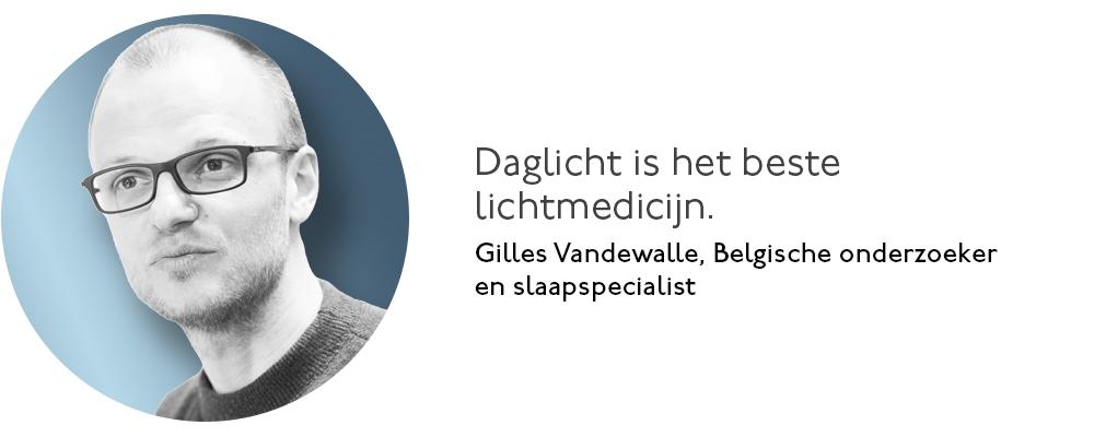 Gilles Vandewalle is een Belgische onderzoeker verbonden aan het FNRS van de Universiteit van Luik, waar hij de link tussen slaap en licht bestudeert. Als codirecteur van het GIGA-CRC-Human Imaging is hij expert op het gebied van slapen, ontwaken en slaap-waakritme, en verdiept hij zich in het effect van licht op het menselijke brein. Zijn voornaamste onderzoeksonderwerp is licht. Niet om wat het toont, maar om wat het in beweging zet. “Wat mij boeit, is de impact van licht op ons brein, los van het gezichtsvermogen.”